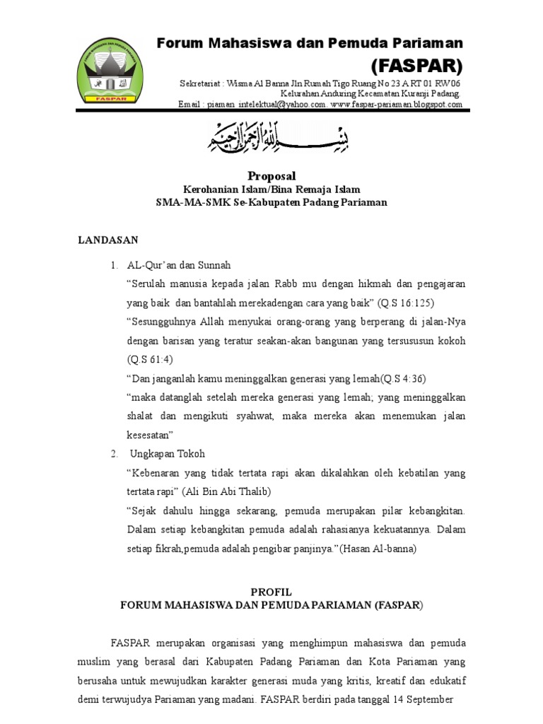 Contoh proposal pengajuan pembentukan organisasi di sekolah kampus. Tri dharma perguruan tinggi 2. Contoh proposal yang umum ialah proposal kegiatan seperti organisasi dan acara pesta rakyat seperti 17 agustus dan masih banyak lagi lainnya. Mereka sering membuat proposal untuk menggalang bantuan dan dukungan atas kegiatan yang diselenggarakan. Sebuah proses pembelajaran harus mampu menghasilkan out put yang benarbenar siap untuk terun didalam masyarakat. Waktu dan tempat kegiatan latihan kepemimpinan manajemen mahasiswa lkmm.