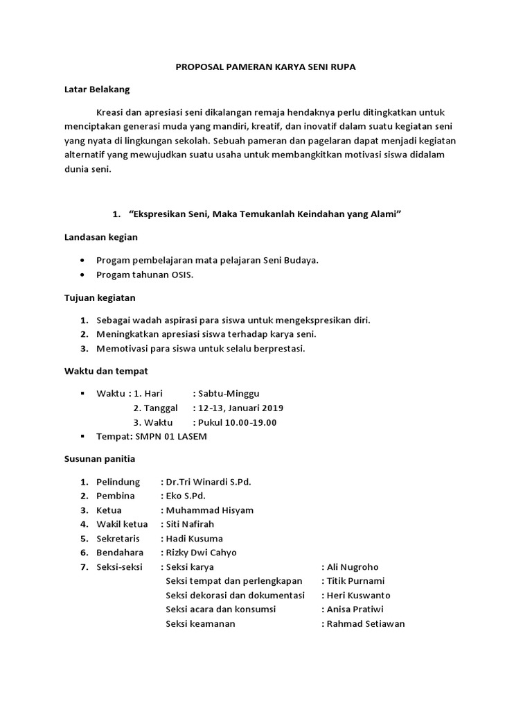 Proposal ini memberikan arahan agar kita dapat mengetahui cara bagaimana mempersiapkan suatu pergelaran seni karya musik dengan alat yang sangat sederhana sekaligus mengembangkan kreativitas siswa dalam bidang seni. Word docx sehingga anda dapat dengan mudah mengedit dan mengubah ubah sesuai kebutuhan masing masing. Contoh proposal pameran proposal merupakan pemaparan ide gagasan atau rencana kerja kegiatan secara tertulis yang bertujuan untuk memberitahukan dan menjelaskan ide pemikiran gagasan atau rencana kerja kegiatan agar mendapatkan dukungan baik dalam bentuk izin ataupun persetujuan. Contoh diatas masih semrawut kawan kawan tapi jangan kecewa dulu karna saya telah menyediakan pula dalam bentuk ms. Proposal ini dibuat untuk memenuhi tugas pelajaran seni musik. Pameran seni rupa yang hendak diselenggarakan ini bermaksud untuk memberikan kesempatan bagi para siswa kelas ix yang memiliki minat terhadap seni umumnyadan seni rupa khususnya.