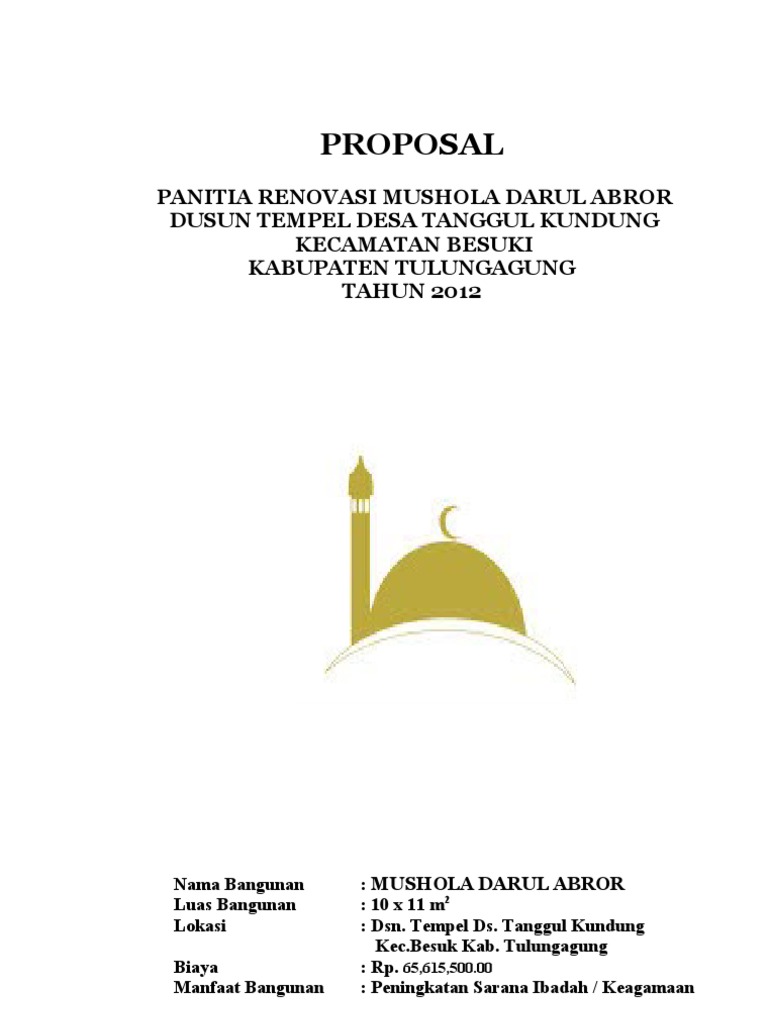 Proposal permohonan bantuan dana pembangunan masjid al istiqomah. Dari waktu ke waktu tidak ada penanganan yang frontal mengakibatkan plafon plafon. Atas perhatiannya kami selaku panitia pembangunan musholla sabilul muttaqin mengucapkan terima kasih. Unduh sebagai docx pdf txt atau baca online dari scribd. Dengan ini kami selaku panitia pembangunan mushola ar rahman yang beralamat di perum griya keira plesungan gondangrejo karanganyar dengan hormat mengajukan proposal permohonan bantuan dana pembangunan mushola ar rahman. Jika membutuhkan file word nya silahkan bisa kunjungi download contoh proposal pembangunan musholla.
