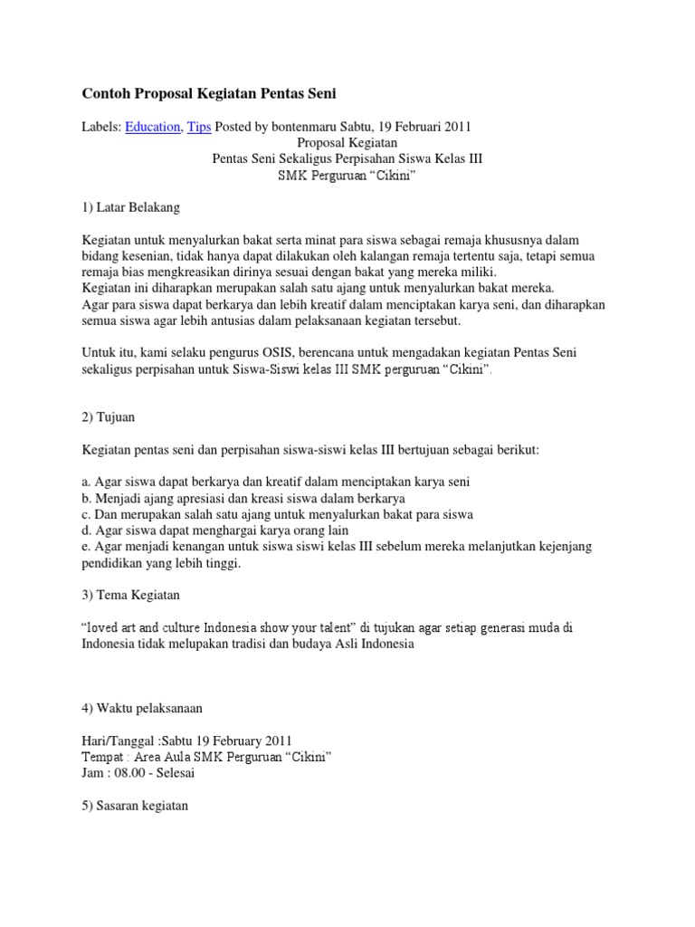 Kesenian merupakan suatu kreatifitas yang harus selalu berkembang terutama kesenian tradisional indonesia yang patut. Kami selaku panitia memohon dukungan dari semua pihak bapakibu guru sponsorship dan donator baik moral maupun materi demi kelancaran acara ini. Jika di instansi misalkan sekolah proposal kegiatan dibuat osis untuk diserahkan kepada kepala sekolah. Jalan babakan tarogong tel. Contoh proposal kegiatan acara pentas seni kali ini admin postingkan contoh proposal kegiatan pentas seni silahkan simak di bawah ini. Proposal kegiatan festival pentas seni dan budaya.