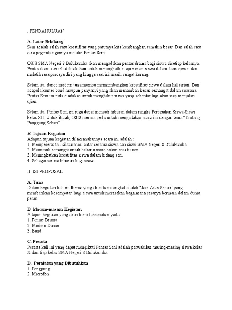 Panitia pentas seni pensi organisasi siswa intra sekolah osis mts sindangraja. Kami selaku panitia mengharapkan dukungan serta bantuan dari segala pihak yang terkait baik secara material tenaga dan ide ide demi terlaksananya acara festival pentas seni dan budaya ini. 1 satu berkas. Contoh proposal kegiatan pentas seni 17 agustus proposal kegiatan adalah proposal yang diajukan mana kala kita akan mengadakan suatu kegiatan. Proposal pelaksanaan pentas seni dalam acara perpisahan siswa siswi kelas xii smkn 1 kepuh.