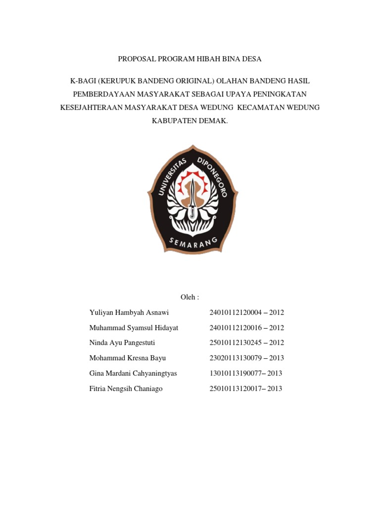 Proposal program hibah bina desa 2016 didanai tahun 2016. Budi sanjaya 51033410022010 erma suryani 41012300042010 rahman safii 51121210052011 sapnita idamarna daulay 41011310282010 unit kegiatan mahasiswa. Contoh proposal bagi kelompok mahasiswa. Pihak pertama dan pihak kedua telah sepakat untuk mengadakan kerjasama dalam perencanaan pelaksanaan program hibah bina desa dengan judul pendampingan desa tani sebagai produsen kerajinan ramah. Peran aktif dan dukungan dari berbagai pihak sangat kami harapkan guna mewujudkan niat rencana dan usaha pelaksanaan bina desa yang insya allah dapat memberikan manfaat bagi kita semua. Hal ini sejalan dengan visi misi jawa barat dengan iman dan taqwa jawa barat menjadi propinsi termaju dan mitra terdepan ibu kota negara pada tahun 2010 yang didalamnya terkandung nilai nilai kehidupan keluarga dan masyarakat silih asahsilih asih juga silih asuh pikeun ngawujudkeun masyarakat anu cageurbageur jeung pinter tur singer.