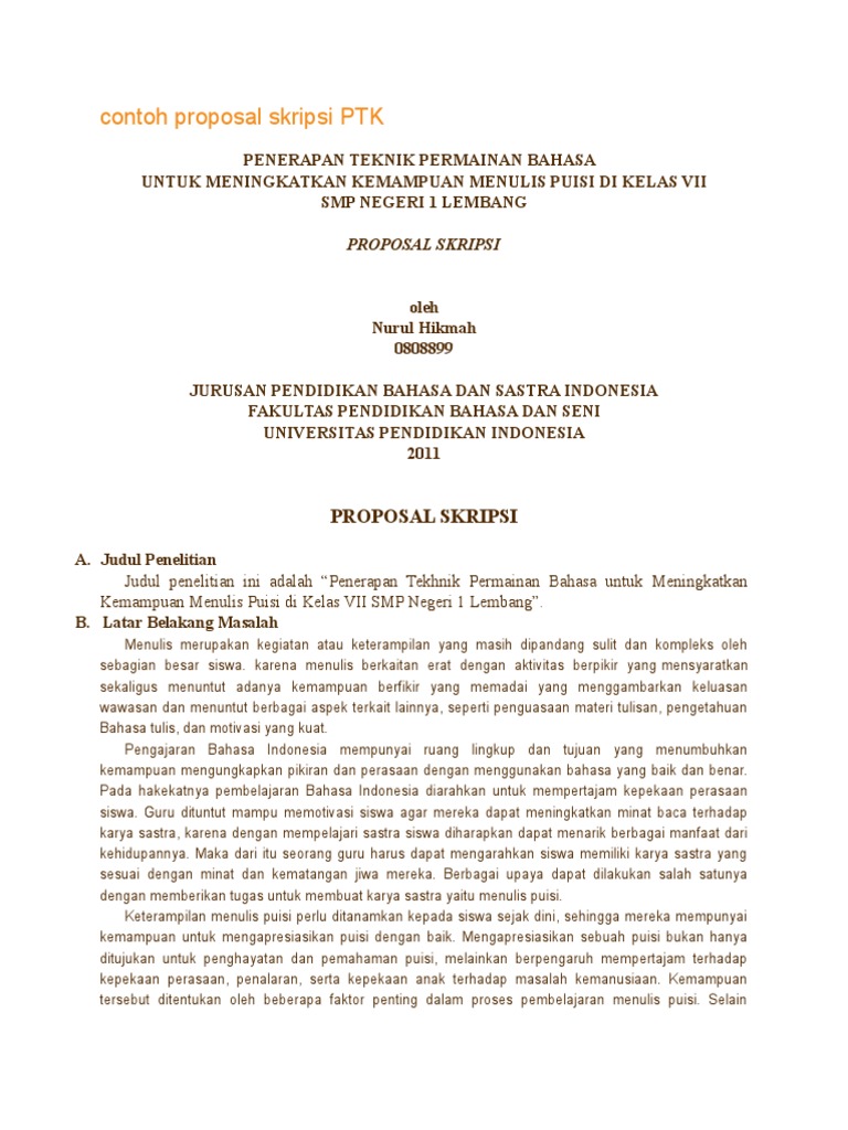 Contoh proposal skripsi pendidikan bahasa indonesia bisa anda dapatkan melalui situs kami. Contoh proposal skripsi setiap mahasiswa pasti akan mengalami yang namanya skripsi atau tugas akhir untuk jenjang sarjana s1. Mereka akan mempersiapkan proposal skripsi untuk diajukan kepada dosen pembimbing. Sebelum anda mengerjakan skripsi anda terlebih dahulu diwajibkan untuk mengirimkan sebuah proposal yang disebut juga sebagai proposal skripsi yang mana di dalam proposal tersebut biasanya berisi informasi secara singkat mengenai skripsi yang anda kerjakan. Contoh proposal pengajuan judul skripsi. Contoh judul skripsi bahasa indonesia terbaik mudah dikerjakan skripsi pendidikan bahasa indonesia adalah skripsi yang sangat menarik buat saya.