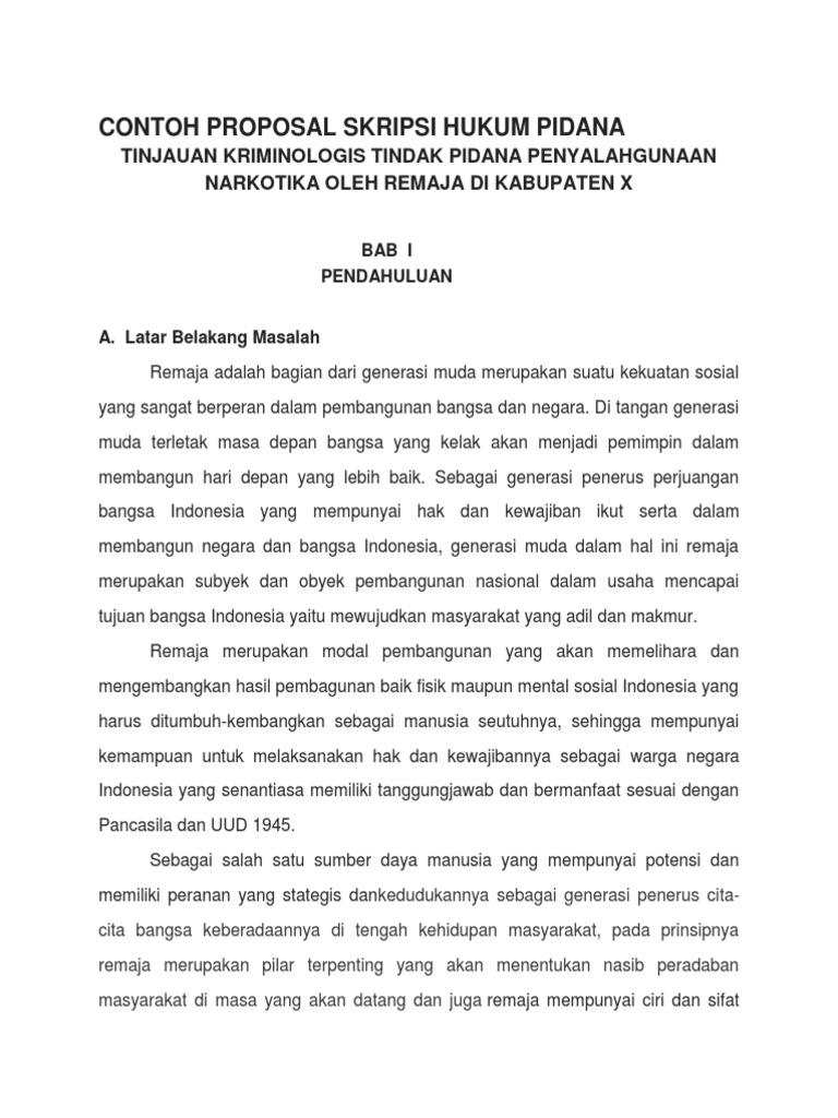 Hingga dengan banyaknya contoh yang kami berikan kepada anda ini diharapkan akan sangat memudahkan anda dalam menyusun skripsinya. Contoh proposal skripsi hukum pidana tinjauan kriminologis tindak pidana penyalahgunaan narkotika oleh remaja di kabupaten x. Hari sasangka 2003 narkotika dan psikotropika dalam hukum pidana mandar maju bandung. Hasil penelitian ini diharapkan dapat memberikan sumbangan penelitian dalam rangka meningkatkan kualitas penegakan hukum pidana khususnya hakim dalam pengambilan keputusan bila nantinya menghadapi kasus yang serupa. Hukum acara pengadilan anak djambatan jakarta. Menyadari kebutuhan tersebut kami menyediakan berbagai macam contoh skripsi hukum pidana dengan berbagai variasi judul yang beraneka ragam.