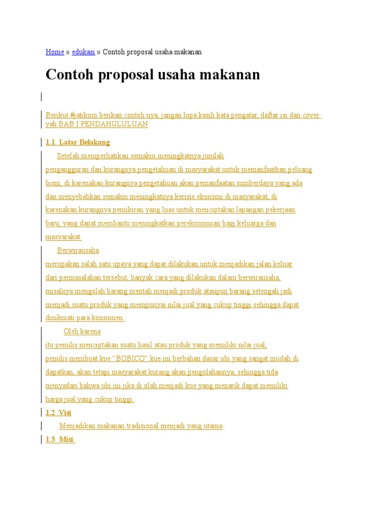 13 misi 1selalu berinovasi dengan produk tradisonal 2meningkatkan kualitas makanan tradisional 3mengutamakan kualitas dalam pelayanan sehingga konsumen puas. Apalagi kebutuhan konsumi di indonesia ini sangat tinggi sekali. Ketika hendak memulai sebuah bisnis usaha disektor makanan jasa dan sebagainya tentunya anda membutuhkan modal yang tidak sedikit. Contoh proposal usaha makanan indonesi memiliki banyak sekali jenis jenis masakan yang enak enak. Saya punya contohnya ni makalah hasil saya sendiri hhe tapi di bimbing ama yang lebih bisa d. Terkadang anda membutuhkan bantuan dana dari investor maka salah satu solusinya yaitu melakukan pengajuan proposal yang baik dan benar supaya untuk menentukan keberhasilan pengajuan dana.