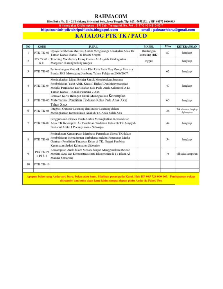 Silahkan download semua filenya di bawah ini. Berkas paud contoh ptk paud penelitian tindakan kelas paud terbaru lengkap untuk anda yang sedang galau mencari karena dituntut untuk membuat ptk sendiri. Berikut ini adalah link download beberapa contoh proposal penelitian tindakan kelas ptk untuk paud yang telah kami rangkum secara lengkap. Dokumen contoh ptk sd smp sma terbaru. Contoh ptk paud tersebut disajikan dalam bentuk skripsi lengkap mulai dari halaman judul abstrak kata pengantar bab i bab ii bab iii bab iv bab v sampai daftar pustaka sehingga layak menjadi rujukan dan dapat menghemat waktu anda mencari referensi di perpustakaan karena anda dapat langsung menerima keseluruhan skripsi tersebut melalui e mail. Contoh ptk paud tersebut disajikan dalam bentuk skripsi lengkap mulai dari halaman judul abstrak kata pengantar bab i bab ii bab iii bab iv bab v sampai daftar pustaka sehingga layak menjadi rujukan dan dapat menghemat waktu anda mencari referensi di perpustakaan karena anda dapat langsung menerima keseluruhan skripsi tersebut melalui e mail.