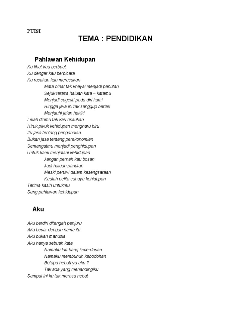 Pada halaman ini kami memberikan kumpulan puisi pendidikan yang diambil dari berbagai sumber dengan tujuan tentu saja menjadi bahan referensi dan inspirasi buat kamu dalam membuat karya tulis puisi bertema pendidikan. Semakin baik pendidikan disuatu negara maka akan semakin baik pula tingkat kehidupan masyarakatnya. Sehingga dalam menentukan tema puisi anak itu berkisar di antara kehidupannya sebagai anak kecil. Puisi pendidikan karya norman adi satria. Kumpulan puisi semangat belajar contoh puisi pendidikan untuk anak. Tak jarang mereka menuangkannya dalam bentuk puisi pendidikan yang semata mata menuangkan gagasan mengenai semua seluk beluk yang terjadi.