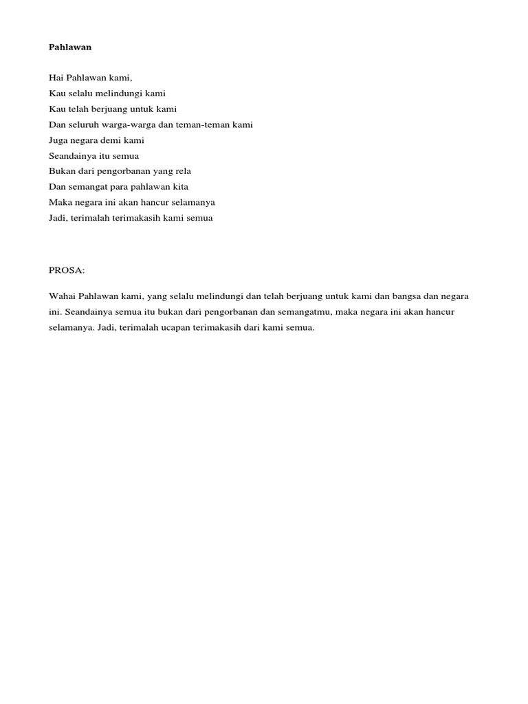 Contoh puisi ke prosa sumardi menuliskan bahwa puisi adalah karya sastra dengan bahasa yang dipersingkat dipadatkan bahasanya dan diberi irama cocok bunyi yang padu dengan pemilihan kata kiasan yang mempunyai sifat imajinatif. Novel laskar pelangi ave maria dan lainnya. Ibu amir juga sakit parah dan akhirnya meninggal. Contoh prosa lama fabel dongeng legenda hikayat berikut ini contoh contoh prosa lama. Puisi anak pada contoh puisi anak anak umumnya lebih simpel dari puisi orang dewasa karena pada dasarnya anak anak menulis puisi hanya berdasarkan apa yang ia senangi saja dan apa yang ia rasakan. Sehingga dalam menentukan tema puisi anak itu berkisar di antara kehidupannya sebagai anak kecil.