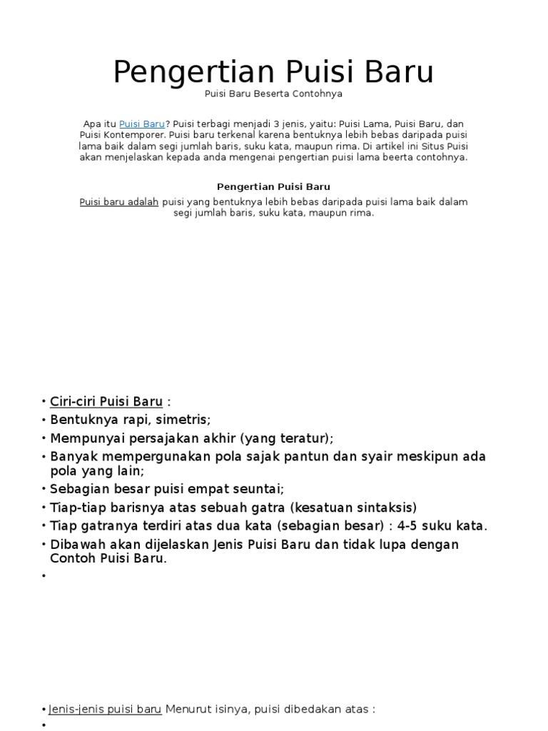Contoh puisi baru adalah seperti berikut. Apa perbedaan puisi lama dan puisi baru. Puisi baru bentuknya lebih bebas dibanding puisi lama bebas dalam segi jumlah suku kata jumlah baris maupun sajaknya. Tiap jenisnya memiliki ketentuan yang berbeda dengan jenis lainnya. Jenis jenis puisi baru beserta pengertian dan contohnya setelah sebelumnya kita memaparkan mengenai jenis jenis puisi dan jenis jenis puisi lama maka pada kesempatan kali ini materi yang akan dibahas adalah jenis jenis puisi baruseperti yang telah dibahas sebelumnya puisi baru merupakan salah satu jenis puisi di indonesiauntuk lebih memahami jenis jenis puisi baru beserta pengertian. Pengertian puisi lama puisi adalah suatu sastra hasil ungkapan pikiran dan perasaan manusia dengan menggunakan bahasa yang terikat pada irama mantra rima penyusunan lirik dan baik serta penuh dengan makna.