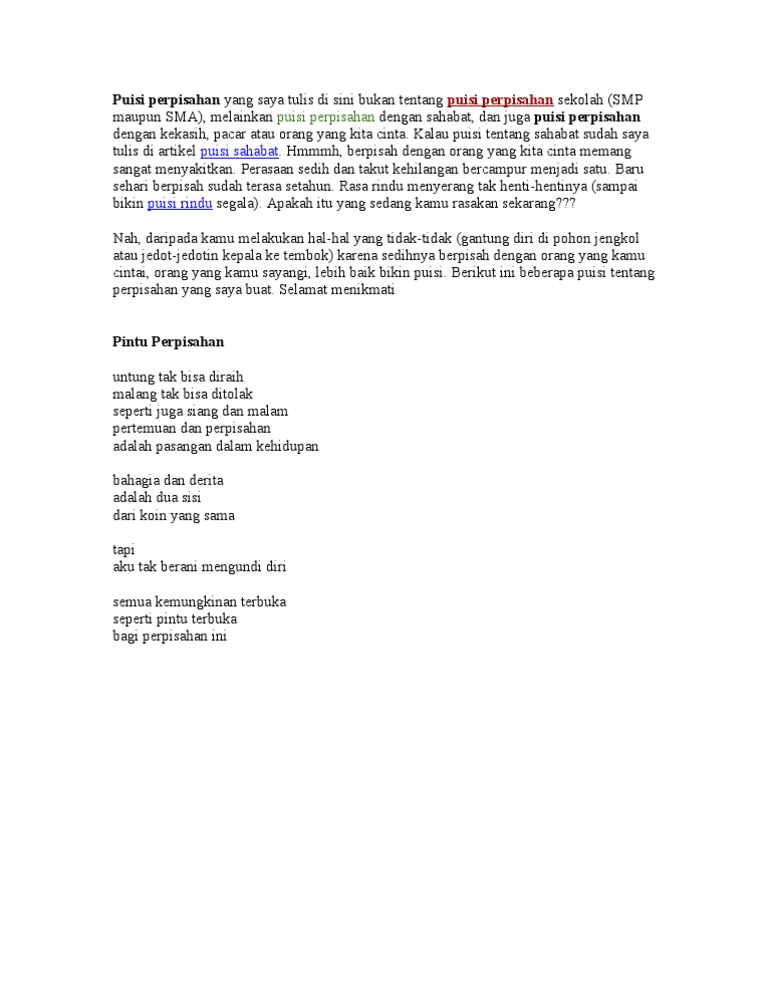Bagaimana tidak kebersamaan yang telah dipupuk sekian lama harus berhenti seketika. Pantun perpisahan sekolah mari tetap melangkah menjelang acara perpisahan di sekolah biasanya kita akan sibuk dengan berbagai persiapan. Puisi perpisahan sekolah perpisahan memang suatu hal yang berat untuk dihadapi namun berpisah bukan berarti menghilang. Puisi perpisahan sekolah sekolah adalah tempat kita menimba ilmu bermain belajar dan bertemu dengan orang orang barudi sekolah kita bisa bertemu dengan teman teman dan bahkan kadang berakhir dengan sahabat dan cinta. Berikut adalah puisi sekolah lengkap. Memang itulah hal hal pada masa sekolah yang tidak bisa terulang lagi.