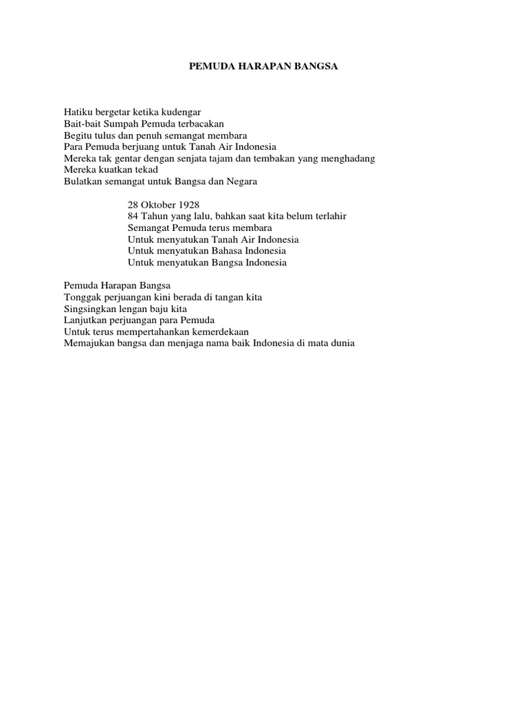 Berikut ini adalah beberapa contoh puisi sumpah pemuda. Puisi sumpah pemuda para pejuang indonesia banyak yang melakukan perjuangannya untuk indonesia dapat merdeka. Kongres ini telah melangsungkan 3 rapat yang diadakan di gedung katholieke jongenlingen bond waterlooplein yang sekarang menjadi daerah lapangan banteng dan di oost java bioscoop koningsplein clubgebouw kramat 106. 5 contoh puisi tentang sumpah pemuda terbaru puisi merupakan suatu gambaran imajinatif manusia dengan kata kata yang tersusun secara sistematis. Puisi memperingati hari sumpah pemuda. Contoh puisi tentang sumpah pemuda.
