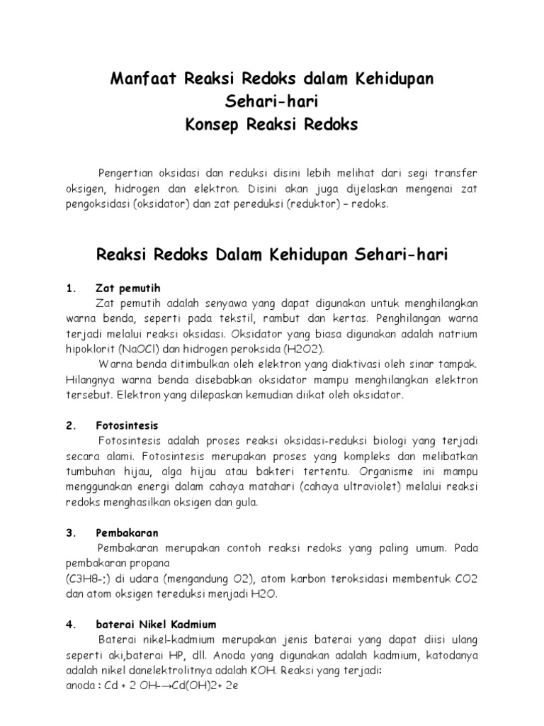Oksidasi merupakan pelepasan elektron oleh sebuah molekul atom atau ion. Contoh makalah kimia reaksi redoks makalah tentang reaksi redoks. Oksidasi adalah interaksi antara molekul oksigen dan semua zat yang berbeda. Berikut ini penulis sarikan dari berbagai sumber terkait contoh contoh reaksi redoks dalam kehidupan sehari hari. Materi berinteraksi untuk membentuk produk baru melalui proses yang disebut reaksi kimia atau perubahan kimiawi. Permulaan reaksi redoks kimia dalam kehidupan sehari hari pada intinya reaksi kimia bisa terjadi di manapun di sekitar kita bukan hanya di laboratorium.