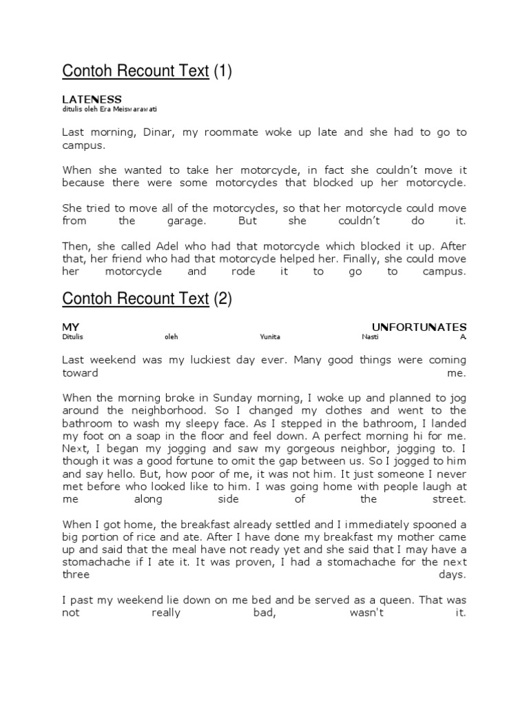 Artikel ini diharapkan bisa membantu anda dalam belajar bahasa inggris atau mengerjakan tugas khususnya bab recount text. There is no complication among the participants and that differentiates from narrative generic structure of recount 1. Orientation one of my favourite things in junior high school was camping. Introducing the participants place and time 2. He always taught slowly so that we could have good understanding. Contoh recount text biografi dalam bahasa inggris lengkap dengan terjemahan dan pembahasan materi by pustaka bahasa inggris posted on november 22 2019 november 29 2019.