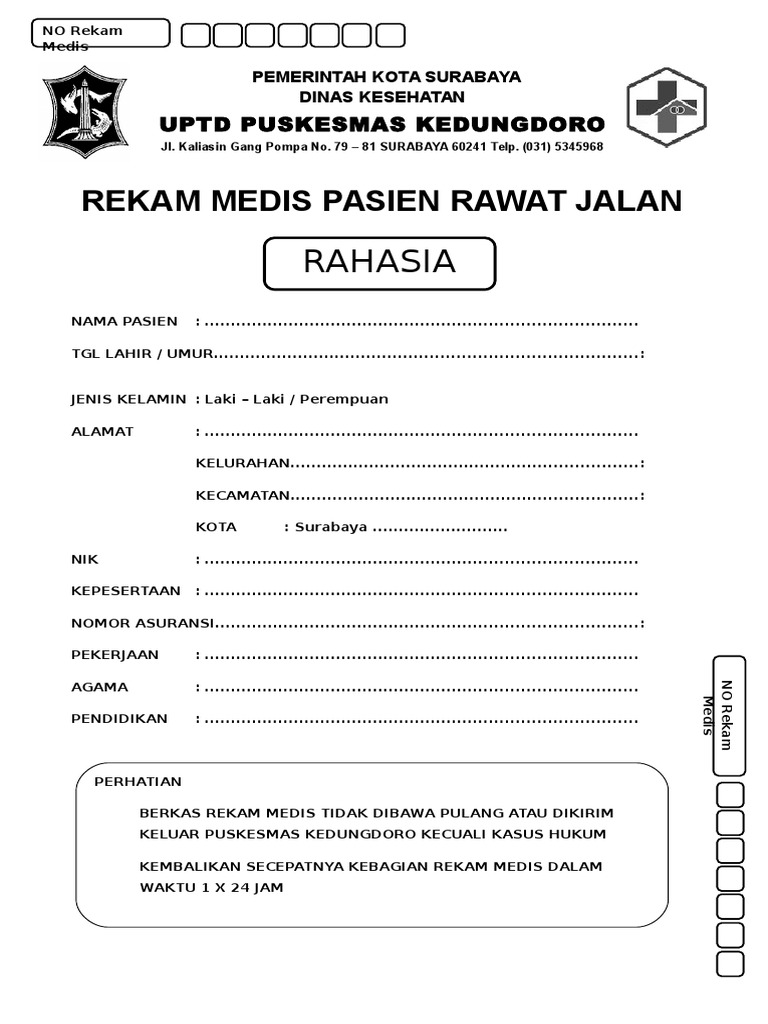 Catatan perkembangan nama pasien. Berisi identitas pasien hasil anemnesis keluhan utama riwayat sekarang riwayat penyakit yang pernah diderita riwayat keluarga tentang penyakit yang mungkin diturungkan atau yang ditularkan diantara keluarga hasil pemeriksaan fisik laboratorium pemeriksaan kasus lainnya diagnostik karja dan pengobatan atau tindakan. No rekam medik. Dapatkan dokumen akreditasi puskesmas lengkap. Telusur yang sudah tersusun tiap ep hubungi wa. Rekam medis untuk pasien rawat jalan termasuk pasien gawat darurat.