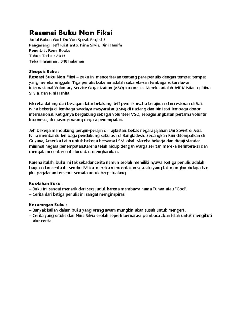 Sebuah resensi penting untuk seorang pembaca karena dengan mengetahui ulasan sebuah buku yang akan dibaca. Semoga dapat bermanfaat dan dapat menambah wawasan kamu tentang bagaimana caranya meresensi buku non fiksi yang baik dan benar. Contoh resensi buku non fiksi populer dan terbaru 2017. Menulis resensi terdiri dari kelebihan kekurangan dan informasi yang.