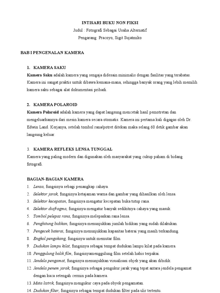 Contoh ringkasan buku non fiksi. Non fiksi kreatif adalah cerita berisi sebuah data real yang di kembangkan menjadi sebuah imajinasi dala bentuk karangan tertentu seperti novel puisi dan sebuah prosa. Non fiksi murni adalah cerita ini memiliki isi yang menurut pengembangan yang di dasari dari data data otentik. Kata resensi itu sendiri berasal dari bahasa belanda yaitu resentie dan diterjemahkan juga ke dalam bahasa latin recensio yang memiliki arti mengulas kembali. Dalam terjemahannya di kamus kbbi resensi memiliki arti sebuah ulasan buku. Contoh resensi buku non fiksi pengetahuan. Semoga dapat bermanfaat dan dapat menambah wawasan kamu tentang bagaimana caranya meresensi buku non fiksi yang baik dan benar.