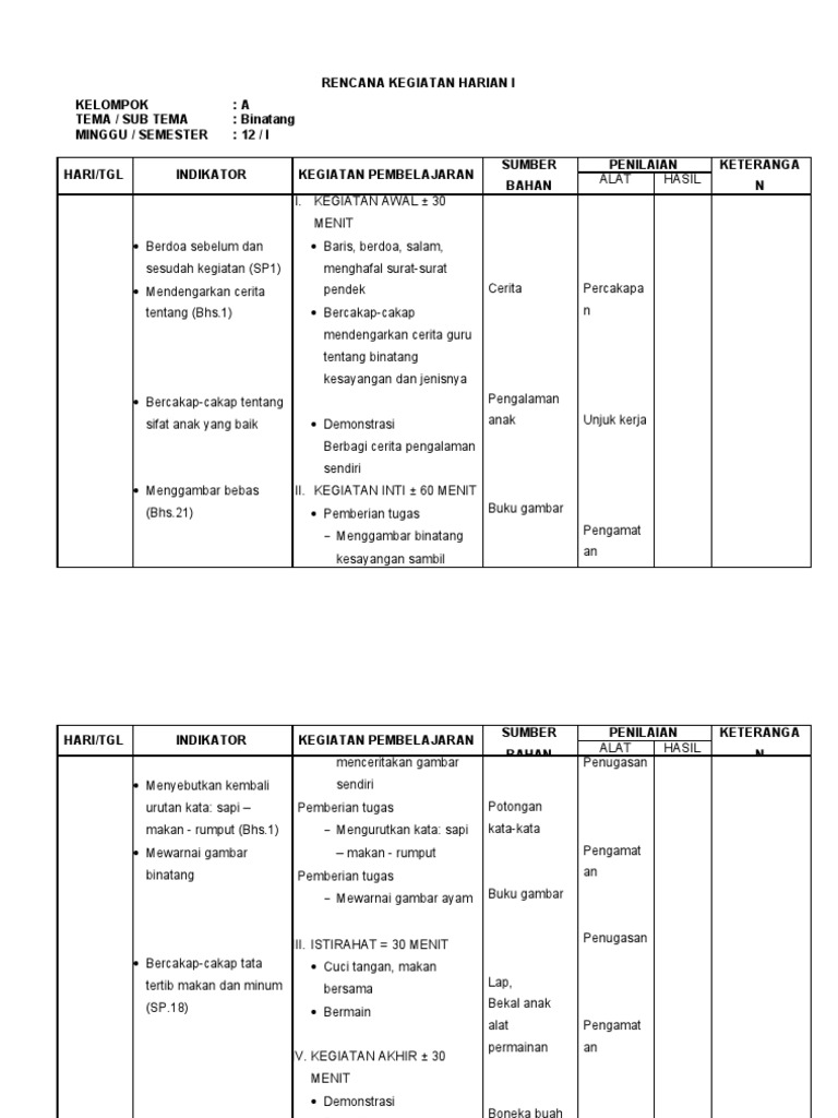 Perkembang bahasa yang ter. Rkh rkm paud tema binatang. Rkh merupakan unit perencanaan terkecil yang bertujuan untuk memandu program dalam sehari hari biasa juga disebut dengan rencana pelaksanaan pembelajaran harian rpph yang berisi program yang dipilih dari indikator yang direncanakan untuk satu hari sesuai dengan tema dan subtema. Adminsitrasi paud salah satu penunjang kelengkapan administrasi guru perangkat pembelajaran dikelas kali ini kami bagikan salah satunya yakni rpph rencana pelaksanaan pembelajaran harian dengan tema binatang sub tema binatang di air dan sub sub tema ikan yang termasuk dalam materi kurikulum 2013 k13 untuk digunakan di semester 1 kelompok a. Sebelum bunda mendownload contoh rpph paud dulu disebut dengan rkh paud atau rencana kegiatan harian sesuai dengan kurikulum 2013 perlu diketahui bahwa rpph paud yang ada di bawah ini hanya sebagai contoh dan acuan di dalam mengembangkan rpph paud sesuai dengan kebutuhan dan kondisi paud masing masing. Contoh rkh dengan tema binatang binatang ternak teori montessori dan jhon loc.