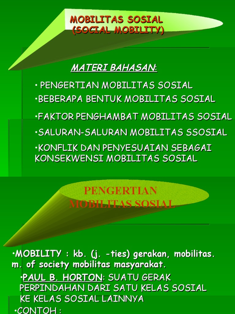 Saluran mobilitas sosial gerak sosial mobilitas sosial adalah perpindahan status sekelompok orang ke status yang lainmobilitas sosial lebih mudah terjadi pada masyarakat terbuka karena lebih memungkinkan untuk berpindah strata dari pada pada masyarakat tertutup. Adalah perubahan susunan status orang orang dalam masyarakat baik secara vertikal maupun secara horizontal. Menurut pendapat dari soerjono soekanto pengertian dari mobilitas sosial ialah suatu gerak dalam struktur sosial yaitu pola tertentu yang mengatur organisasi suatu kelompok sosial. Pengertian mobilitas sosial status bentuk jenis faktor pendorong dan arah saluran. Mobilitas sosial atau yang biasa juga disebut dengan gerak sosial berasal dari bahasa latin yakni mobilis yang berarti mudah dipindahkan atau banyak bergerak dari satu tempat ke tempat yang lain. Mobilitas sosial vertikal memiliki saluran saluran dalam masyarakat itulah menurut pitrim a.