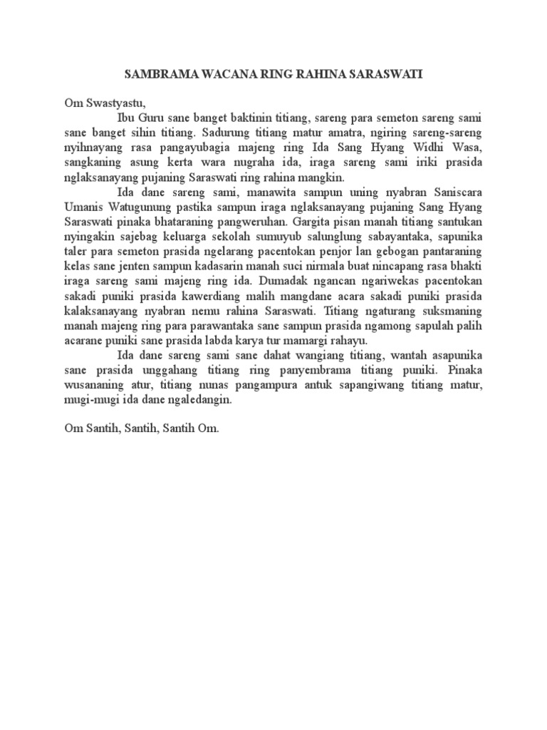 Indik resepsi pawiwahanwantiwarsangenteg linggih msl. Dharma wacana tema ne indik ajaran ajaran agama pidarta tema ne lebih bebas conto ne masalah sosial dll sambrama wacana biasa ne kanggen ritatkala nyanggra tamiu rikala wenten upacara. 1 sembrama wecana tutur lisan mateges nyembrama tamiu antuk bebaosan lisan nenten ngwacen naskah. Nyanggra tamiu undangan resepsi. Ring subha déwasa sané mangkin patut atur uningayang titiang mangda para undangan pawikan mungguing sang sané jagi mawiwaha mangkin ipun sané kapurusa mawasta i kadek widiantana ipun sané mangkin makarya pinaka dosén honorér ring kampus ihdn denpasar alaki rabi ring ipun sané predana mawasta ni wayan apriani ipun pinaka dosén tetap ring stkip agama hindu amlapura. November 28 2011 832 am.