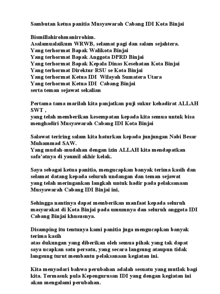 Menyebutkan tamu vip dengan urutan yang tepat misalnya dari pejabat eselon 1 pimpinan organisasi terkait narasumber anggota organisasi dan hadirin. Ahli dan berpengalaman menyusun naskah sambutan dan pidato pejabat politisi pimpinan organisasi tokoh ormas ketua panitia dan sebagainyahub. Membuka dengan mengucapkan syukur. Bismillahirrahmanirrahim yang terhormat dari dcc bandar lampung yang saya cintai. Teks sambutan adalah kumpulan kalimat atau kata kata yang disampaikan. Contoh teks pidato sambutan dalam sesuatu kegiatan bisanya seorang ketua panitia penyelenggara kegiatan haruslah memberi pidato sambutan atau laporan ketua panitia yang disampaikan secara tertulis maupun secara lisan dalam menyambut suatu acara atau kegiatan yang akan dilaksanakan.