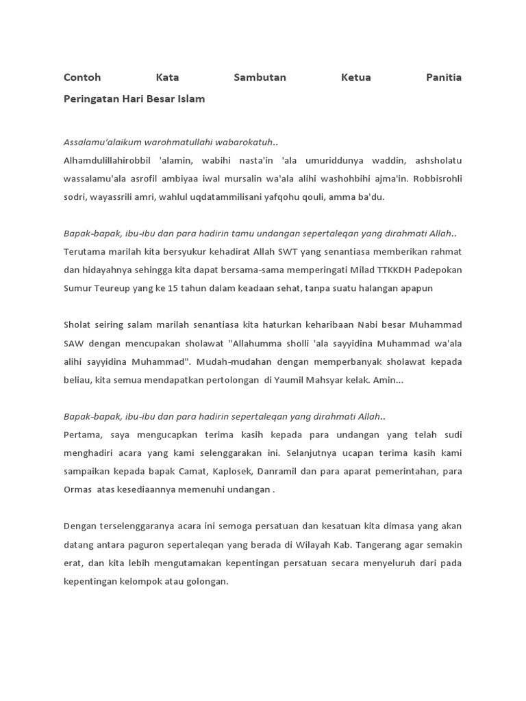Jika butuh bantuan menyusun naskah sambutan silakan wa 0816482 7590. Contoh kata sambutan tuan rumah yang islami contoh kata sambutan ketua panitia. Contoh teks pidato sambutan dalam sesuatu kegiatan bisanya seorang ketua panitia penyelenggara kegiatan haruslah memberi pidato sambutan atau laporan ketua panitia yang disampaikan secara tertulis maupun secara lisan dalam menyambut suatu acara atau kegiatan yang akan dilaksanakan. Apalagi jika anda memang belum terbiasa berbicara didepan. Innal hamda lillah nahmaduhu wa nastainuh wa nastaghfiruh wa naudzu billahi min syuruuri anfusinaa wamin sayyiaati amaalinaa mayyahdihillahu falaa mudhillalah wa mayudhlil falaa haa diya lah. Kata sambutan ini kebiasaannya disampaikan oleh ketua panitia pada beberapa acara disebut dengan laporan ketua panitia ataupun dari kepala instansi ketua organisasi dan sebagainya.