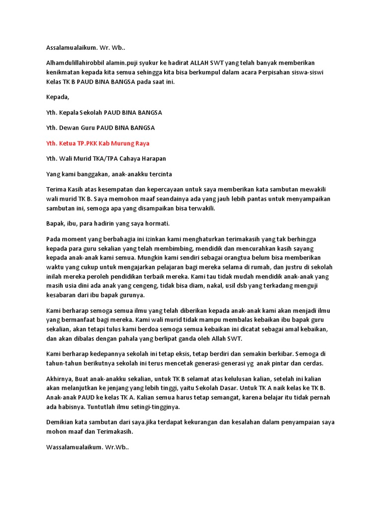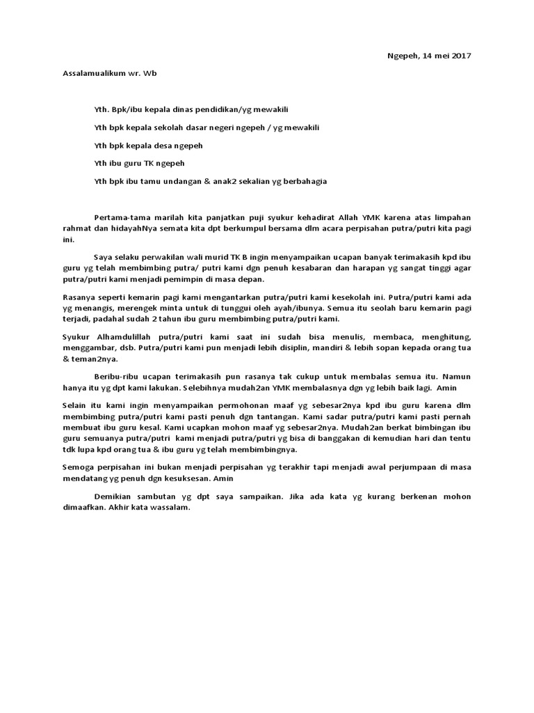 Izinkan saya memberikan kata sambutan mewakili wali murid tk b. Sekian sambutan perpisahan kali ini. Demikianlah contoh pidato kepala sekolah dalam perpisahan kelas yang bisa saudaraku download secara gratis. Saya memohon maaf seandainya ada yang jauh lebih pantas untuk menyampaikan sambutan ini semoga semua hasrat hati yang ingin disampaikan bisa terwakili. Setelah sebelumnya kami memberikan contoh pidato perpisahan siswa sd kali ini kami juga ingin memberikan contoh sambutan wali murid perpisahan tk 2017. Apa bila ada kekurangan kekeliruan kata dalam penulisan naskah pidato kepala sekolah dalam acara kelulusan diatas saudaraku berhak mengedit teks pidato sambutan kepala sekolah dalam perpisahan sekolah ini atau menambahkan kata kata agar lebih baik dan lebih sempurna.