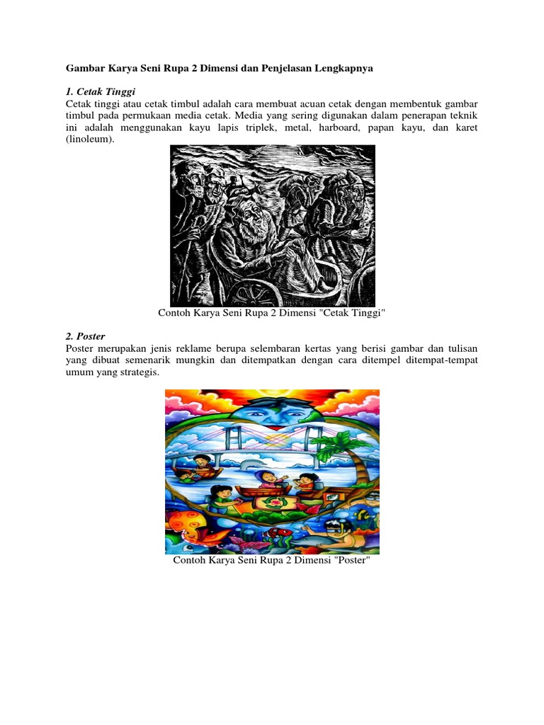 Contoh seni rupa 2 dimensi dan penjelasannya. Seni rupa 2 dimensi seni rupa merupakan salah satu cabang seni yang membentuk suatu karya seni menggunakan media yang dapat dilihat oleh indra penglihatan dan dapat dirasakan melalui indra peraba. Seni rupa 2 dimensi adalah seni rupa yang tertuang hanya pada dimensi panjang dan lebar. Seni rupa 2 dimensi manusia hidup membutuhkan suatu seni agar tidak terasa hambar dan monoton sehingga merasa cepat bosan. Pengertian seni rupa 2 dimensi. Contoh seni rupa 2 dimensi dan 3 dimensi setelah pada kesempatan terdahulu kita pernah mengulas tentang prinsip seni rupa dan gambarnya kali ini giliran contoh seni rupa yang akan kami sajikan. Seni rupa 2 dimensi atau yang biasa disebut dengan istilah dwimatra adalah suatu hasil dari karya seni yang terbentuk dari dua unsur saja.