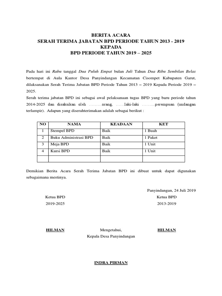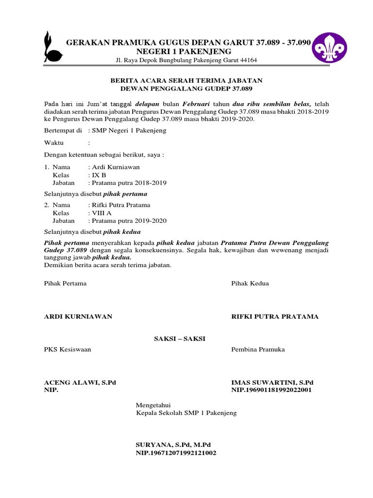 Jika anda mencari contoh berita acara serah terima jabatan bendahara maka anda berada di tempat yang tepatblog contohenem memiliki banyak koleksi gambar seperti contoh berita acara serah terima jabatan bendahara gambar ini tersedia dalam format jpg png gif. Ada banyak hal yang harus disiapkan saat serah terima jabatan ini salah satunya adalah surat serah terima jabatan. Biasanya surat serah terima digunakan untuk pengiriman barang atau dokumen sebagai tanda bukti bahwa barang yang telah dikirim telah diterima. Semoga dapat menjadi bahan referesi dalam membuat surat serah terima yang baik dan sah. Fb twitter wa line pinterest g linkedin. Jendral sudirman kilometer 35 jakarta.