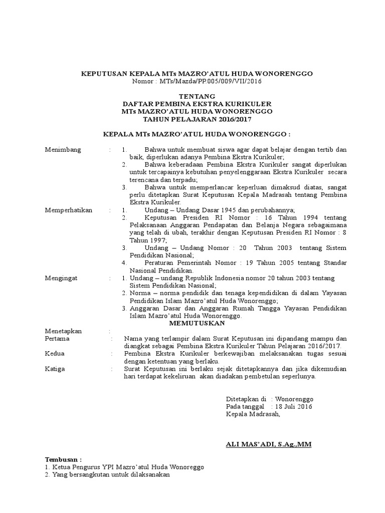 Sk Surat Keputusan Pembagian Tugas Pembina Ekstrakurikuler
