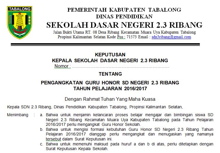 Contoh sk guru honor. Kumpulan contoh surat keputusan sk kepala sekolah lengkap administrasi sekolah sk kepala sekolah surat keputusan atau yang biasa lebih dikenal dengan sk merupakan sebuah surat pernyataan yang dikeluarkan oleh lembaga tertentu formal maupun non formal yang berisi suatu kebijakan atau keputusan tertentu yang berhubungan dengan lembaga tersebut. Jadi anda tidak perlu khawatir mendownload dan menggunakan file file ini di perangkat komputer anda. Guru honor ataupun gtt umumnya sk nya dibuat oleh kepala sekolah. Contoh sk pengangkatan guru honordoc. File contoh sk pengangkatan guru honor format microsoft word pada link di atas yang bisa anda download ini disimpan di cloud storage google drive untuk menjamin keamanan file dari virus atau malware file otomastis melewati proses scan anti virus oleh sistem google drive. Bagi anda gtt ataupun kepala sekolah yang butuh contoh sk pengangkatan guru honorgtt terbaru di sini saya memberikan contohnya.
