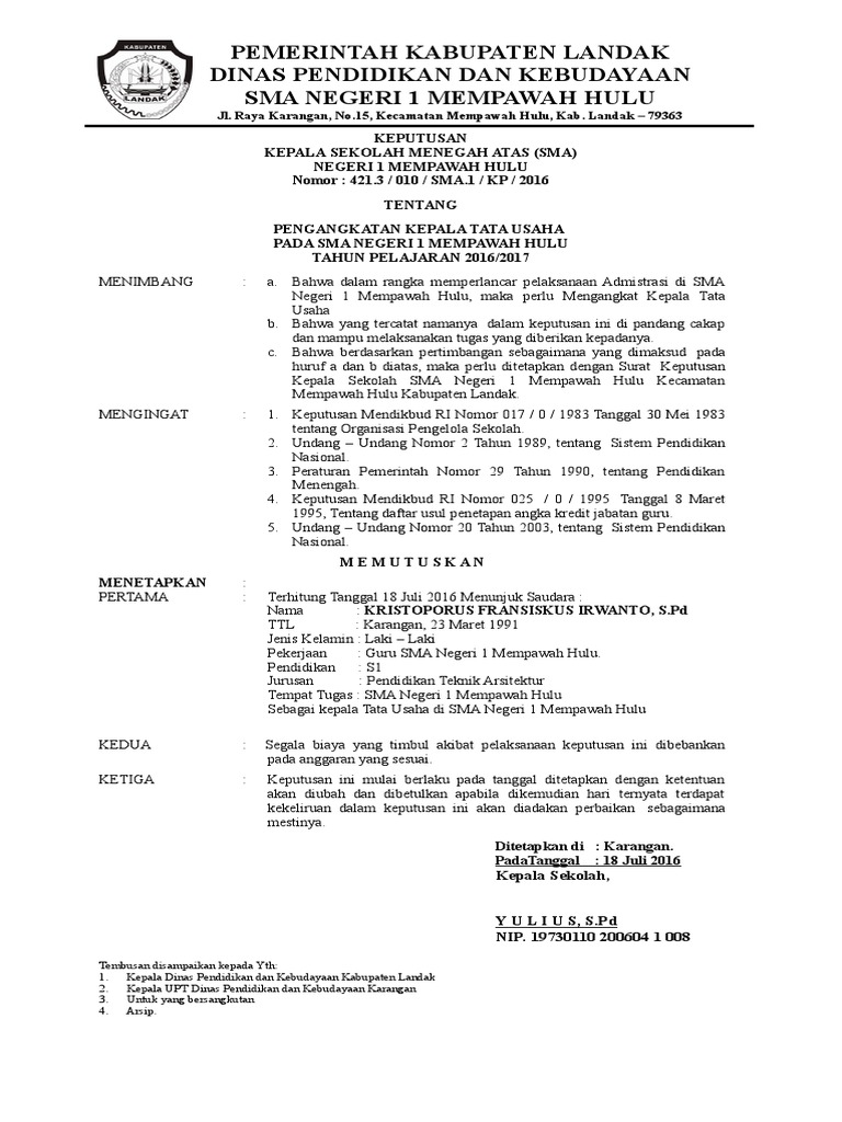 Contoh sk kepala sekolah. Akhirnya kami sampaikan terima kasih. Surat keputusan untuk operator sekolah ini bertujuan untuk mengangkat seorang staff agar memiliki tanggung jawab terhadap komputerisasi di sekolah. Kumpulan contoh surat keputusan sk kepala sekolah lengkap administrasi sekolah sk kepala sekolah surat keputusan atau yang biasa lebih dikenal dengan sk merupakan sebuah surat pernyataan yang dikeluarkan oleh lembaga tertentu formal maupun non formal yang berisi suatu kebijakan atau keputusan tertentu yang berhubungan dengan lembaga tersebut. Surat keputusan kepala sekolah tentang masa pengenalan lingkungan sekolah download demikian yang bisa kami sampaikan terkait dengan kesibukan sekolah dalam mengawali tahun pelajaran baru semoga bermanfaat dan mohon maaf segala kekurangannya. Yayasan pendidikan islam al fata pasir agung. 22 contoh sk kepala sekolah dan guru lengkap merupakan file contoh berkas guru yang bisa digunakan untuk melengkapi semua keperluan administrasi guru di sekolah yang berhubungan dengan 22 contoh sk administrasi administrasi guru download kepala sekolah dan bisa juga di gunakan sebagai bahan perbandingan atau referensi yang sesuai dengan keperluan guru dan sekolah agar lebih mudah dalam.