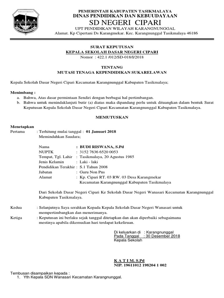 Contoh sk mutasi guru honorer. Baiklah langsung saja ke sedikit pembahasa dari file berkas mutasi yang akan kami bagikan. Namun ada beberapa hal yang harus anda lengkapi dan anda lampirkan pada surat tersebut. Baik guru swasta ataupun guru honorer sama saja dimana mereka harus bisa melampirkan surat mutasi kepada dinas terkait. Contoh surat mutasi guru sd doc berikut adalah surat berupa file document yang dibagikan untuk kepala sekolah dasar yang sedang mencari dan akan menggunakannya untuk membuat surat mutasi bagi guru yang ingin memohon pindah dari sd asal ke sd yang baru perpindahan antar sekolah. Contoh sk mutasi pegawai. Kumpulan contoh surat keputusan sk kepala sekolah lengkap administrasi sekolah sk kepala sekolah surat keputusan atau yang biasa lebih dikenal dengan sk merupakan sebuah surat pernyataan yang dikeluarkan oleh lembaga tertentu formal maupun non formal yang berisi suatu kebijakan atau keputusan tertentu yang berhubungan dengan lembaga tersebut.
