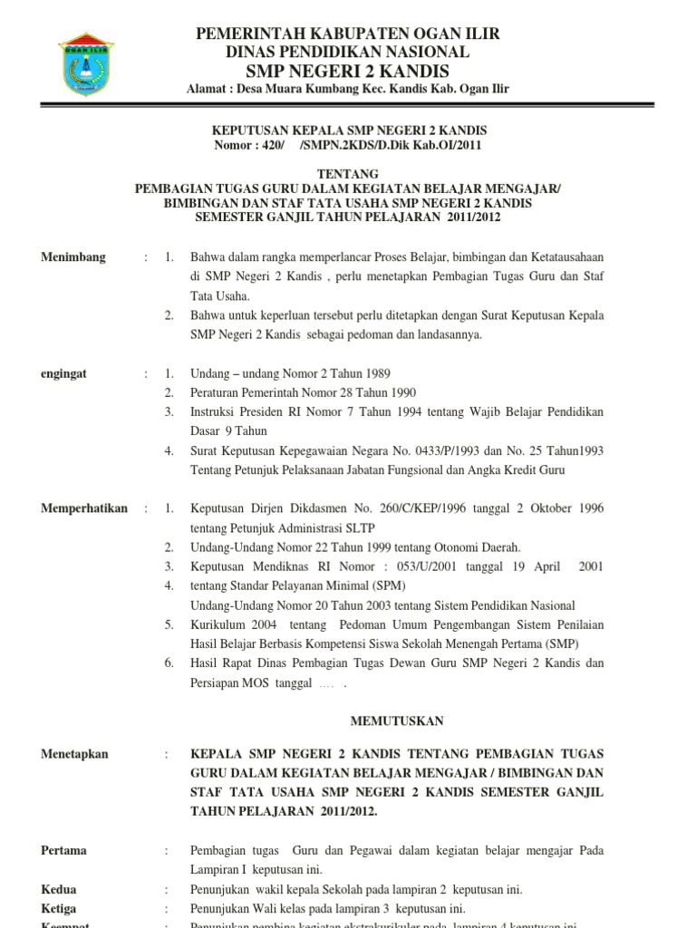 Contoh sk pembagian tugas mengajar smp. Berikut ini contoh sk pembagian tugas mengajar 20192020 di tkpaud sdmi smpmts smasmkma dilengkapi lampiran. Menyambut datangnya tahun ajaran baru maka diperlukan sk pembagian tugas mengajar yang baru pula baik jenjang sd smp maupun sma. Guna mempermudah pembuatan sk dimaksud kami bagikan contoh sk pembagian tugas mengajar tahun ajaran 2017 2018. Sebelum menampilkan contoh sk pembagian tugas guru sk kbm ada beberapa hal yang perlu saya sampaikan. Tes akademik calon kepala sekolah contoh instrumen respon. Lalu apa sih sk pbm itu.