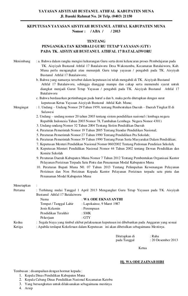 Softgaleri adalah blog yang berbagi informasi kode administrasi dalam surat menyurat administrasi aplikasi dan administrasi guru yang mana file berikut ini adalah kumpulan dari berbagi sumber tentang contoh surat pengangkatan kepala sekolah oleh yayasan yang bisa bapakibu gunakan dan diunduh secara gratis dengan menekan. Academiaedu is a platform for academics to share research papers. Berikut ini adalah download rpp silabus prota prosem kkm skkd ktsp 2006 sd kelas 5 yang merupakan kumpulan file dari berbagi sumber documentktsp 2006ktsp sdrpp silabus tentang contoh sk bendahara sekolah yayasan. Surat keputusan kepala sekolah bendahara paud. Berikut informasi sepenuhnya tentang contoh sk pengangkatan kepala sekolah smk oleh yayasan doc. Pengangkatan kepala kelompok bermain melati.