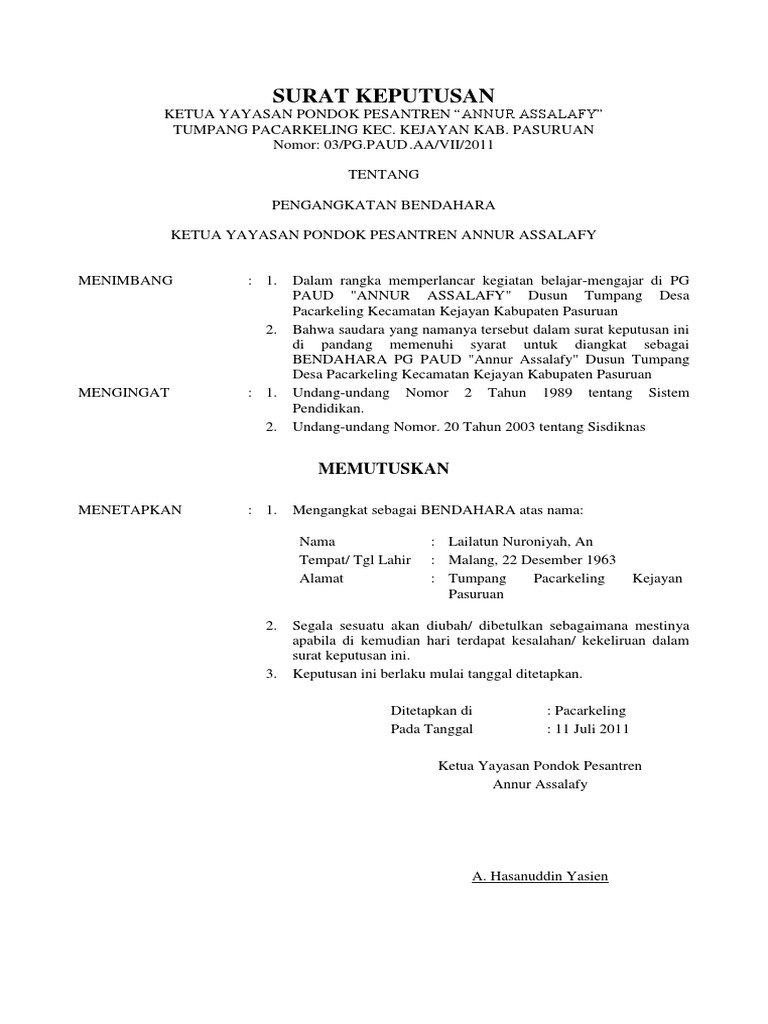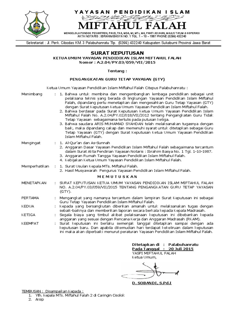 Pondok pesantren miftahul huda. Surat keputusan ketua yayasan miftahul huda. 15 contoh surat keputusan yang baik dan paling lengkap dalam suatu instansi perusahaan lembaga organisasi maupun beberapa kelompok lainnya tentu akan pernah menggunakan salah satu contoh surat yang satu ini yakni surat keputusan. Home sk surat keputusan contoh sk kepala sekolah yayasan contoh sk kepala sekolah yayasan. 013 kelurahan baktijaya. 06 juli 2009 nomor.