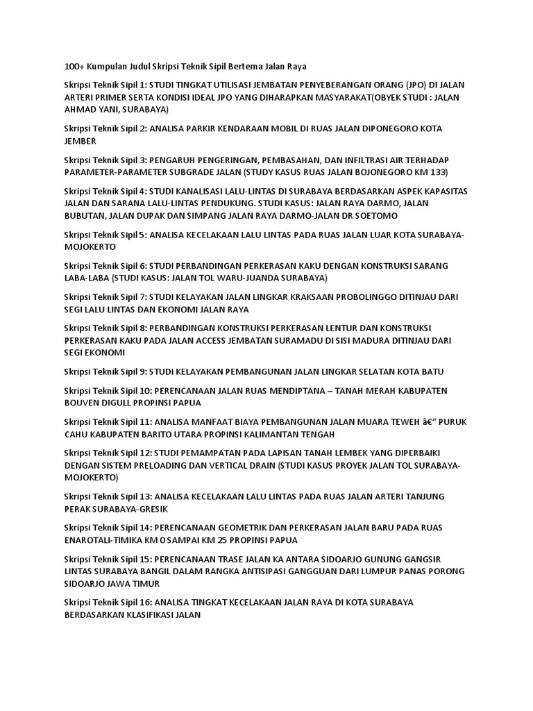 Contoh skripsi teknik sipil tentang jalan raya. Menyadari kebutuhan tersebut kami menyediakan berbagai macam contoh skripsi teknik sipil dengan berbagai variasi judul yang beraneka ragam. Download kumpulan contoh proposal dan skripsi teknik sipil lengkap evaluasi tingkat kerusakan jalan sebagai dasar penentuan perbaikan jalan. Oleh karenanya mahasiswa butuh referensi judul dan contoh skripsi lengkap untuk dijadikan penelitian terdahulu. 180 skripsi teknik sipil mudah dikerjakan dan lengkap bisa membantu teman teman yang sedang kesulitan dalam mendapatkan referensi skripsi. Mulai dari cara mencari judul skripsi teknik sipil sampai pada 500 judul skripsi teknik sipil yang telah langsung di posting sebagai gambaran teman teman mahasiswa teknik sipil dalam menemukan judulnya sendiri untuk penelitian yang wajib dilakukan sebagai syarat terpenting penyelesaian. Melalui artikel berjudul 475 kumpulan contoh judul skripsi teknik sipil terlengkap dan terbaru in saya coba untuk menyajikan judul judul skripsi yang paling bagus dan mudah dikerjakan oleh temen temen semua.