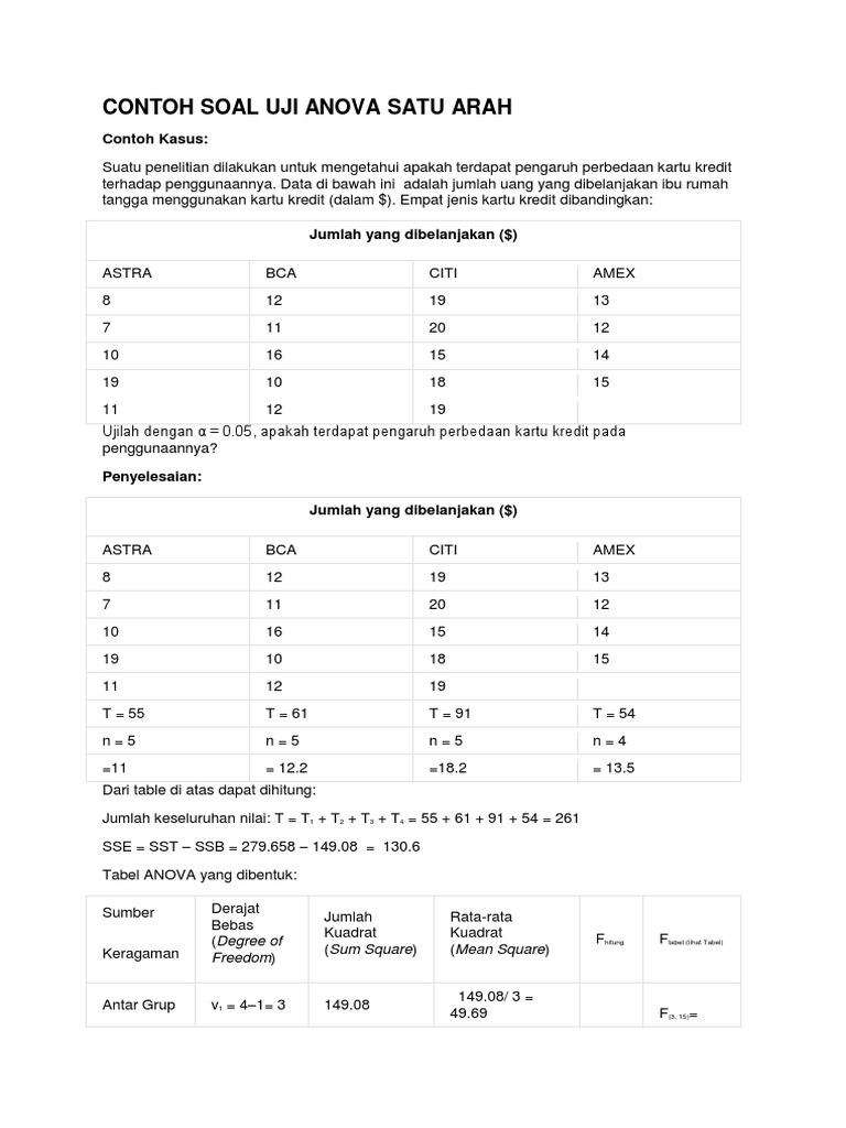 Data di bawah ini adalah jumlah uang yang dibelanjakan ibu rumah tangga menggunakan kartu kredit dalam. Ia merupakan pengembangan dari masalah behrens fisher sehingga uji f juga dipakai dalam pengambilan keputusan. Suatu penelitian dilakukan untuk mengetahui apakah terdapat pengaruh perbedaan kartu kredit terhadap penggunaannya. Menyumbang positif terhadap konsep diri matematika siswa dengan uji hipotesis uji f anova menghasilkan f hitung f tabel 14514 3443 dan signifikansi 005 0001 005. Pengertian dalam sebuah penelitian terkadang kita ingin membandingkan hasil perlakuan treatment pada sebuah populasi dengan populasi yang lain dengan metode uji hipothesis yang ada distribusi z chi kuadrat atau distribusi t. Grup disini bisa berarti kelompok atau jenis perlakuan.