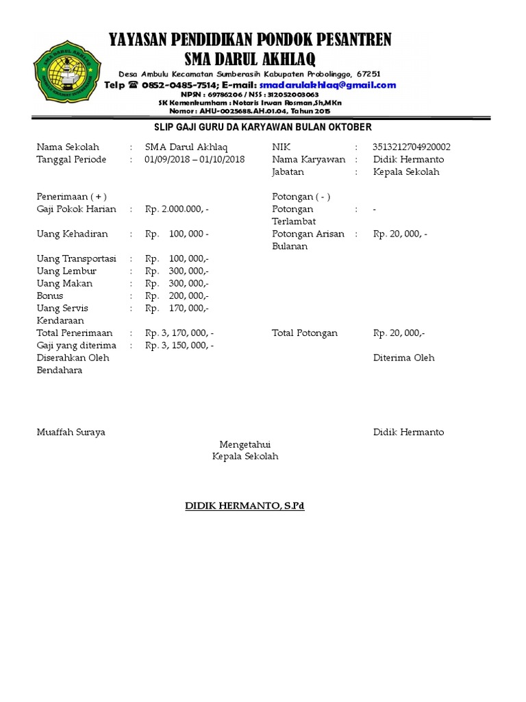 Contoh slip gaji guru yayasan. Slip gaji ini juga menerangkan berapa total take home pay yang diterima oleh karyawan. Contoh slip gaji karyawan dari perusahaan. Pasalnya ketika saat saat itulah kita merasakan kesusahan ekonomi. Contoh slip gaji selamat datang di portal hidupsimpel yah pada kesempatan kali ini kita akan membahas tentang contoh slip gaji. Bagi kebanyakan karyawan tanggal tua termasuk momok yang lumayan menakutkan. Contoh slip gaji karyawan resmi adalah bukti resmi pembayaran gajipenghasilan seorang karyawan.