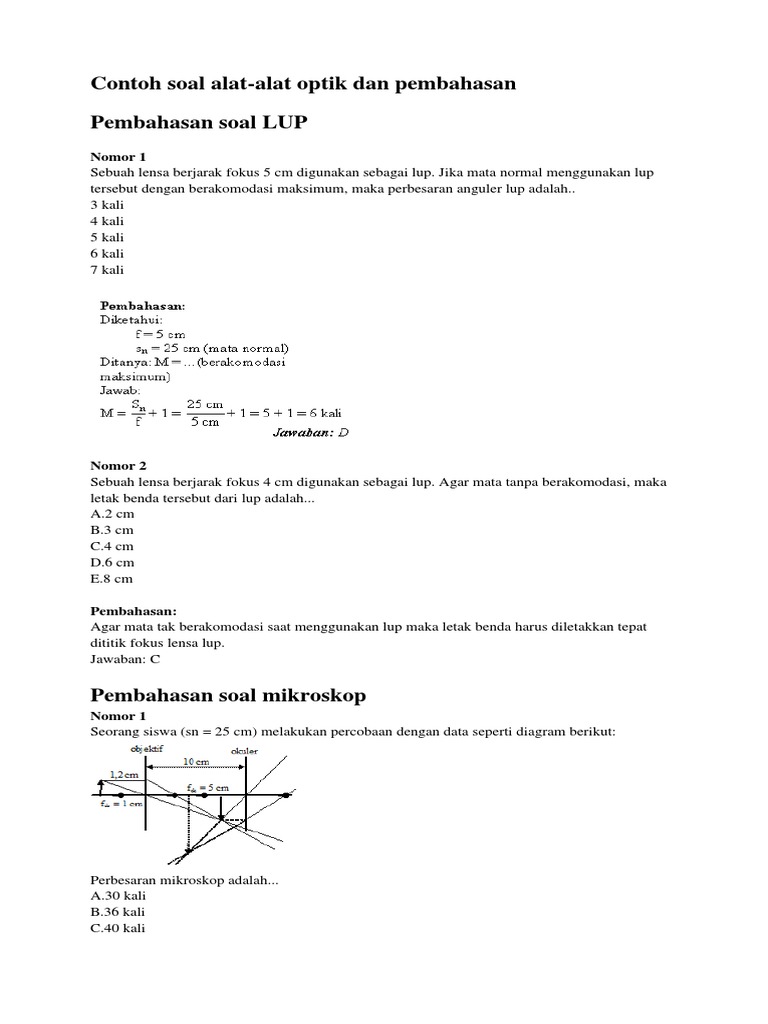 Jadi dengan menggunakan lup. Juni 10 2019 januari 15 2020 admin contoh soal lup lup. Soal ini berdasarkan kurikulum terbaru yaitu kurikulum 13. Soal dan pembahasan alat optik ketika sinar cahaya menumbuk bidang cermin sinar cahaya akan memantul dari cermin. Contoh soal cahaya dan alat optik ini disusun dalam bentuk pilihan berganda dilengkapai dengan pembahasan dan dirancang sedemikian berdasarkan beberapa subtopik yang paling sering keluar dalam kajian cahaya dan alat optik. Mata merupakan alat optik tercanggih karunia dari tuhan yang mengalahkan alat optik terbaik yang pernah ada.