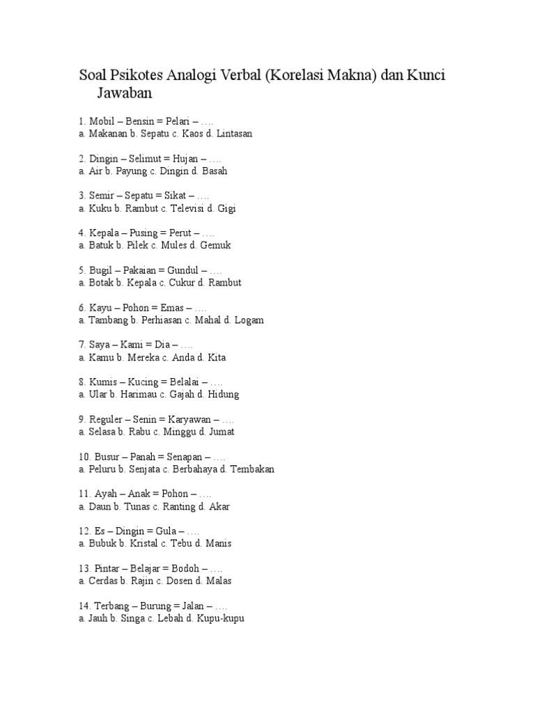 Contoh soal analogi beserta jawaban. Apabila anda menemukan hubungan kata yang terbentuk dari dua kata yang diujikan masih bersifat terlalu umum maka anda akan kesulitan untuk menentukan alternatif jawaban yang paling tepat untuk. Contoh soal psikotes dan kunci jawaban lowongankerja15com salam bagi semua para pencari loker seluruh indonesia kesempatan kali ini admin tidak membagikan informasi mengenai lowongan kerja terbaru tetapi akan memberikan contoh soal psikotes beserta pembahasannya. Cdokter pasien e. Petani sawa b. Dibawah ini adalah beberapa contoh soal analogi atau padanan kata yang bisa anda gunakan untuk belajar sebelum mengikuti test potensi akademik pada cpns kantor atau perusahaan. Contoh soal tes verbal potensi akademik dan kunci jawaban pada kesempatan kali ini saya akan memberikan kumpulan contoh soal lengkap untuk tes potensi akademik tpa dengan tema soal tes verbal yang berjumlah 114 soal yang lengkap dengan kunci jawabannya.