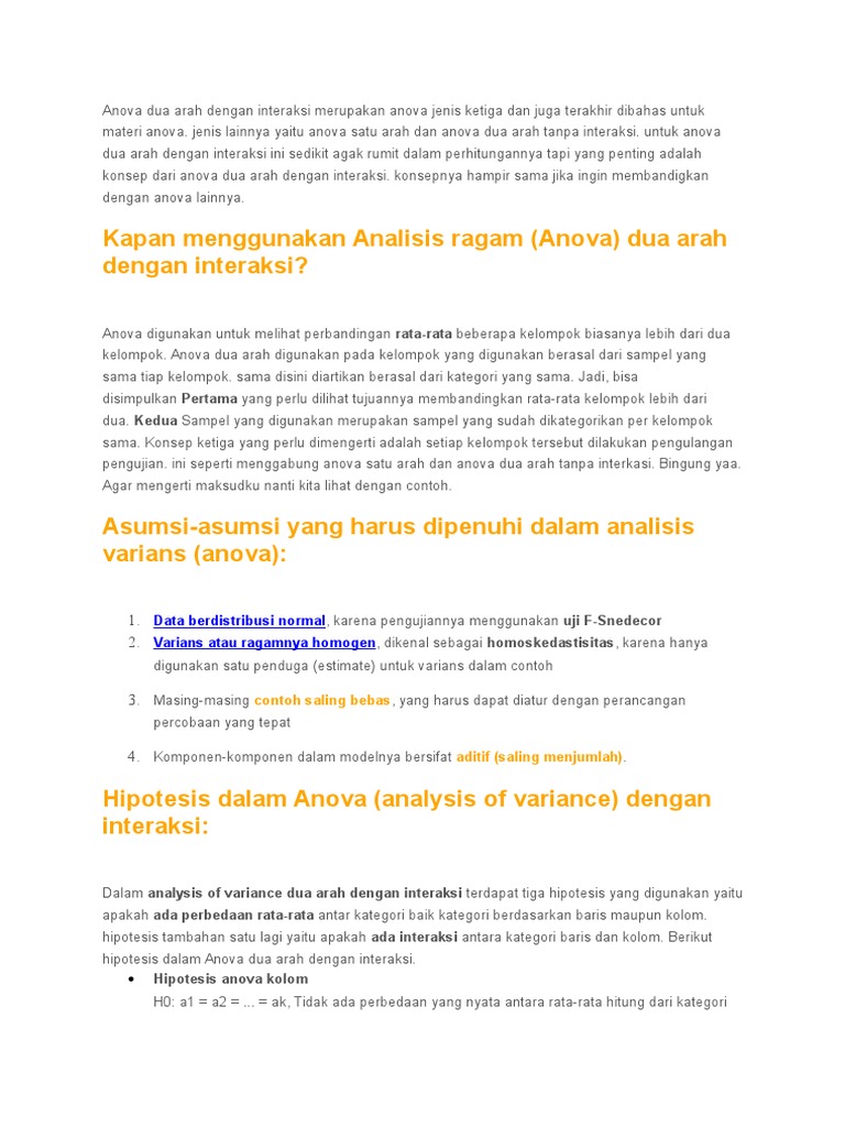 Anova dua arah tanpa interaksi merupakan pengujian hipotesis beda tiga rata rata atau lebih dengan dua faktor yang berpengaruh dan interaksi antara kedua faktor tersebut ditiadakan. Anova merupakan bagian dari metoda analisis statistika yang tergolong analisis komparatif lebih dari dua rata rata riduwan2008dasar dasar statistikabandungalfabeta. Untuk anova dua arah dengan interaksi ini sedikit agak rumit dalam perhitungannya tapi yang penting adalah konsep dari anova dua arah dengan interaksi. Bimbingan menjawab soal uji two way anova dengan spss lengkap penggunaan uji anova dalam analisis data penelitian pada dasarnya bertujuan untuk mengetahui apakah ada perbedaan yang signifikan perbedaan yang bermakna pada nilai rata rata dari beberapa kelompok data. Sebagai contoh dalam suatu percobaan kimia kita ingin mengubah tekanan reaksi dan waktu reaksi secara serentak dan meneliti pengaruh masing masing pada hasil reaksi. Dalam metode anova yang perlu diperhatikan ada empat seperti pada keterangan diatas.