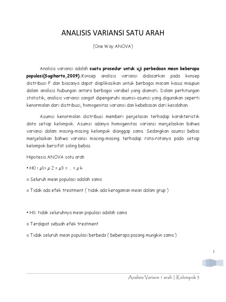 Kali ini kita akan membahas anova satu arah. Populasi terdistribusi normal. Anova satu arah one way anova seperti yang dijelaskan sebelumnya bahwa analysis of variance atau anova merupakan salah satu metode analisis statistika yang digolongkan ke dalam kelompok statistik inferensialdalam artikel mengenai analisis varians atau analisis ragam kita telah membagi 2 analisis berdasarkan kebutuhannya yaitu anova satu arah dan anova dua arah. Bagaimanapun keuntungan teknik analisis varian ini adalah memungkinkan untuk memperluas analisis pada situasi dimana hal hal yang sedang diukur dipengaruhi oleh dua atau lebih variable. Untuk itu kita memerlukan sebuah metode yang cepat dan beresiko mengandung kesalahan lebih kecil yakni anova analysis of variance 1. Unknown on 2 mei 2016 2140 mas saya mau tanya nie.