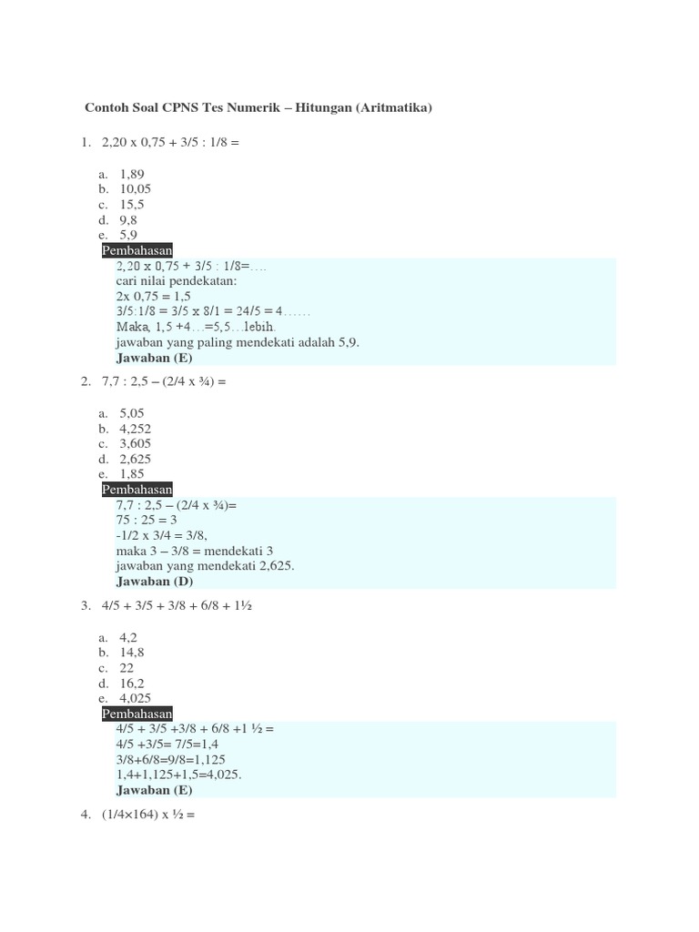 Soalcpnsinfoasnid contoh soal cpns tes numerik aritmatika. Contoh soal tkd cpns 2019 berikut ini adalah contoh soal tes inteligensia umum tiu tes aritmatika atau hitungan biasa. Contoh soal cpns pdf dan kunci jawaban aritmatika silogisme soal cpns pdf dan kunci jawaban pembahasannya untuk bentuk aritmatikan dan silogisme tiu tahun 2018 dijelaskan secara rinci lolos. Mudah menjawab contoh soal cpns tiu aritmatika sosial jual beli untung rugi duration. Tips pengerjaan soal cpns hitungan matematika. Berikut adalah contoh soal skd cpns deret dan aritmatika.