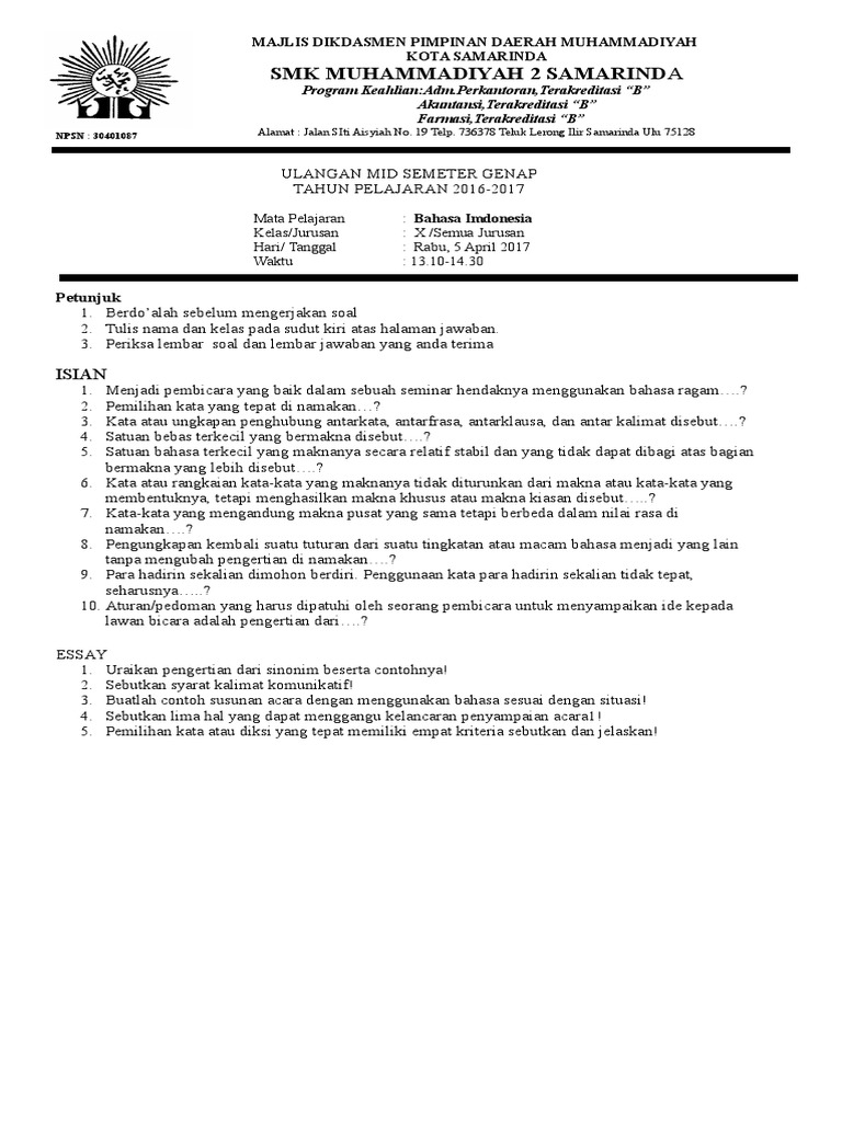 Contoh soal bahasa indonesia kelas 10 semester 1 dan 2 beserta jawabannya kurikulum 2013. Soal bahasa indonesia kelas 10 semester 2 kurikulum 2013 bagian ketiga ini berisikan materi yang sama dengan soal essay bagian ke 2 yaitu tentang debatdan soal pg bagian ketiga merupakan lanjutan dari soal pg bagian pertama dan kedua soal nomor 11 25 dengan materi yang berbeda. Tornado wreaks havoc in semarang. Materi essay tentang teks negoisasi sebelumnya berjumlah 10 soal. Suatu interaksi antara 2 orang atau lebih dalam bentuk pengetahuan musyawarah atau pun ilmu tertentu yang bertujuan untuk memberikan pemahaman yang benar disebut. Materibelajarcoid akan membahas tentang contoh soal bahasa indonesia kelas 11 smksma beserta kunci jawabannya.
