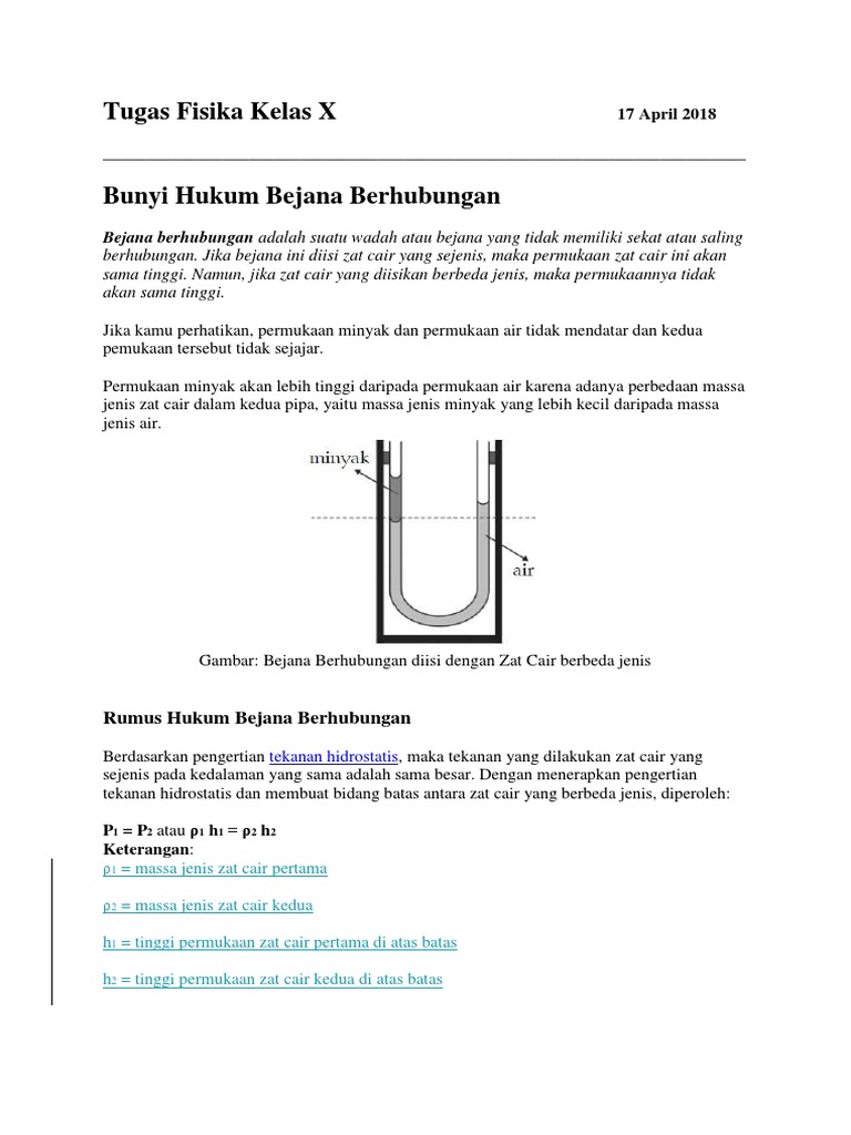 Contoh soal tentang bejana berhubungan pada sebuah pipa u terdapat air massa jenis 1000 kgm 3. Pembahasan soal bejana berhubungan pipa u. Pada sebuah pipa u terdapat air massa jenis 1000 kgm3. Jika diketahui beda ketinggian permukaan zat cair adalah 1 cm hitunglah massa jenis zat cair tersebut. Kumpulan contoh soal dan pembahasan tentang tekanan bejana berhubungan dan hukum pascal untuk smp. Hitunglah selisih ketinggian permukaan zat cair pada kedua pipa u tersebut.
