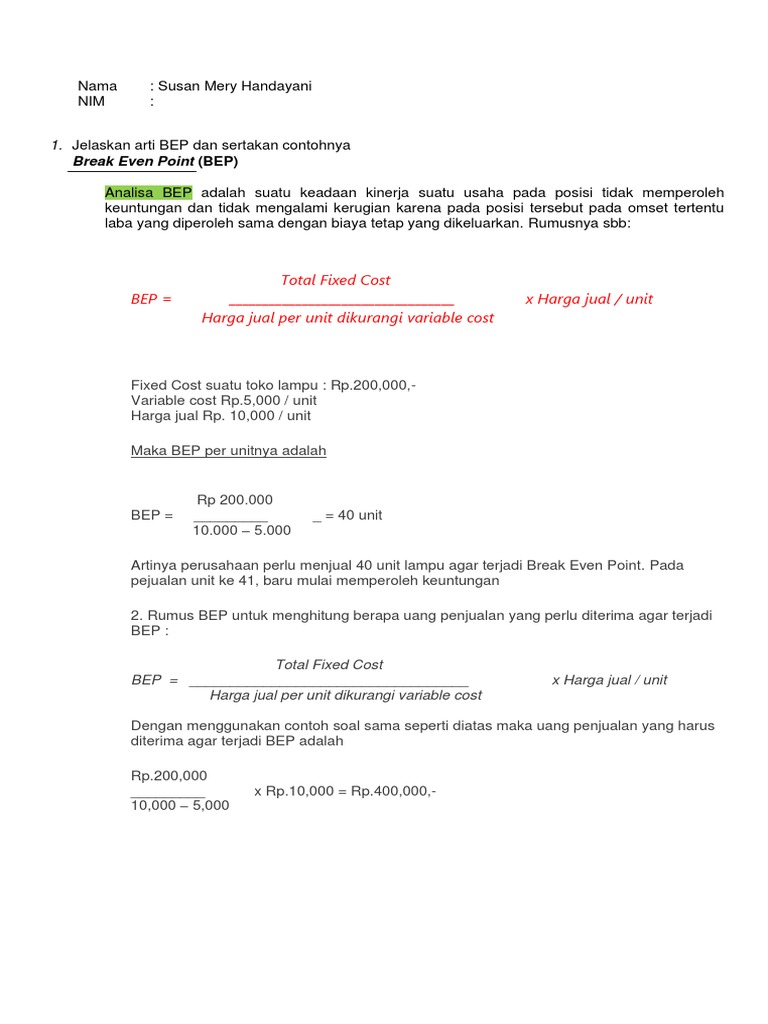 Rumus menghitung break even point bep yang harus diketahui adalah jumlah total biaya tetap. Tulis nama anda di sudut kanan atas.