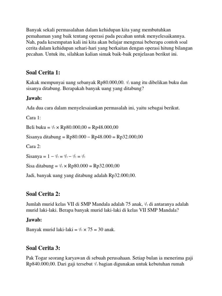 Pada tingkat smp kalian akan mengulang kembali dan memperdalam materi pecahan. Untuk operasi penjumlahan dan pengurangan ini langkah langkahnya sama. Berdasarkan contoh di atas maka hasil dari 12 23 adalah 36 46 76. Nah pada kesempatan kali ini kita akan belajar mengenai beberapa contoh soal cerita dalam kehidupan sehari hari yang berkaitan dengan operasi hitung bilangan pecahan. Perkalian pecahan murni dan campuran sifat operasi hitungan dan pecahan pembagian pecahan murni dan campuran. Guru sd smp sma contoh soal cerita bilangan pecahan smp kelas 7.