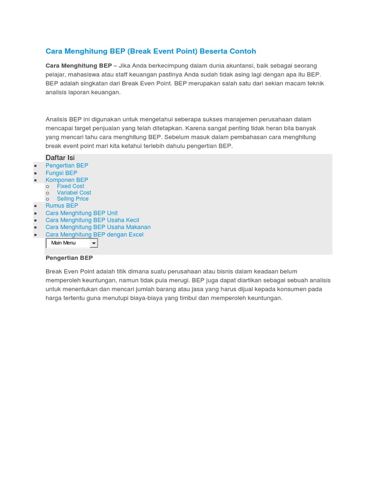 Pengertian analisis break even point analisis bep mempunyai hubungan yang sangat erat dengan program budget walaupun analisa bep dapat diterapkan dengan data historis. Analisa break event point bep adalah titik dimana perusahaan belum memperoleh keuntungan tetapi juga tidak dalam kondisi rugi. Atau bep merupakan suatu teknik analisa untuk mempelajari hubungan antara biaya tetap biaya variabel keuntungan dan volume aktivitas. Budget perusahaan bisnis bangkrut total adalah sebagai berikut. Wigiyanti break even point dan contoh kasus a.
