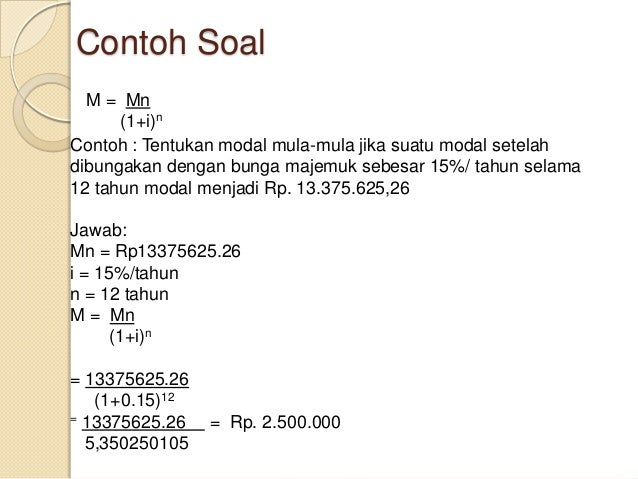 Contoh 1. Pembahasan lebih mendalam tentang teori ini sudah kita bahas dalam artikel saya tentang bunga majemuk. Demikian pembahasan tentang pengertian rumus menghitung dan contoh soal bunga majemuk mohon maaf jika ada kesalahan atau kekurangan dalam penulisan dan pembahasan pada pengertian rumus dan contoh soal bunga majemuk diatas selamat belajar dan memahami tentang bunga majemuk. Silahkan simak contoh soalnya dan jika ada masalah silahkan tanyakan di kolom komentar.