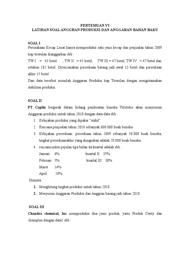 Latihan soal anggaran bahan baku. Jumlah barang yang akan dijual akan mencerminkan pendekatan yang berbeda yaitu kebijaksanaan tingkat produksi yang menekankan pada stabilitas produksi persediaan yang mengambang dan jika kebijaksanaan ditekankan pada tingkat penjualan maka pengendalian tingkat persediaan yang mengambang. Anggaran pembelian bahan baku langsung. Produksi jadi minimal tiap triwulan sebanyak 40 bal dan maksimal sebanyak 60 bal. Anggaran kebutuhan material per triwulan tahun 2005. Anggaran produksi disusun dengan berdasarkan pada anggran penjualan yang telah disusun sebelumnya.